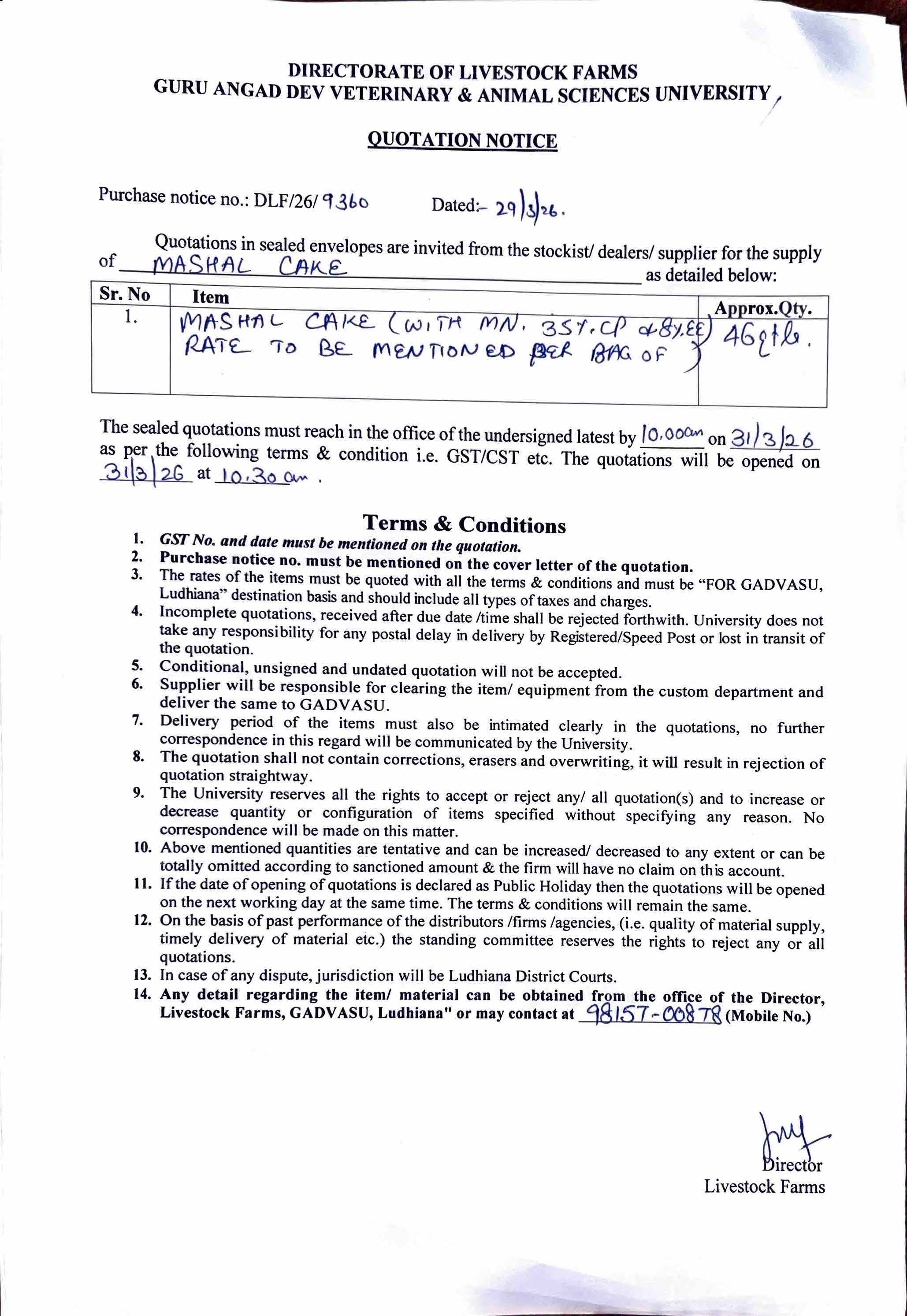 Quotation notice for the supply of Mashal Cake, Director, Livestock Farms, Guru Angad Dev Veterinary and Animal Sciences University Ludhiana