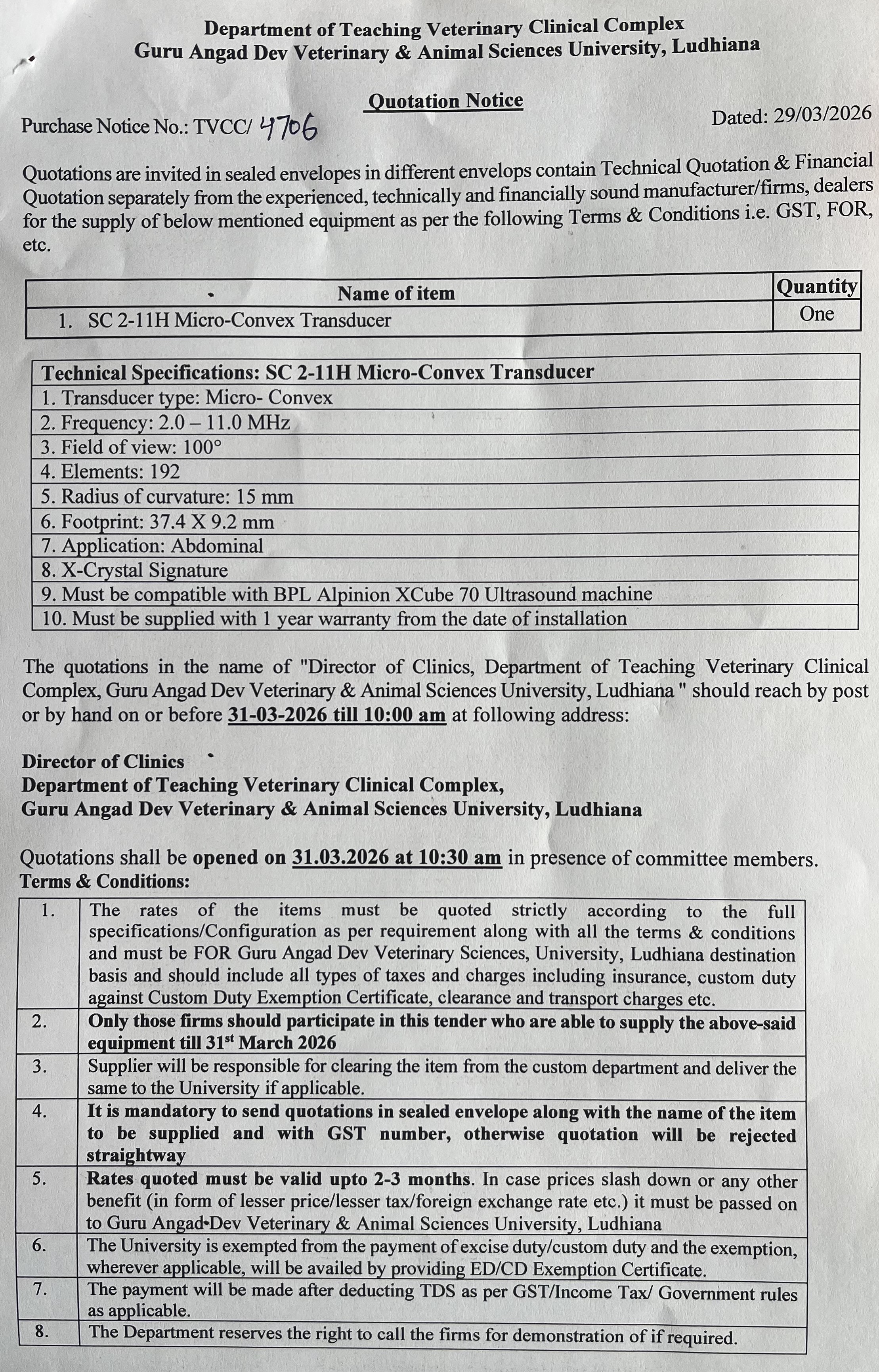 Quotation Notice for the supply of SC 2-11H Micro-Convex Transducer, Director of Clinics, Department of Teaching Veterinary Clinical Complex, GADVASU, Ludhiana
