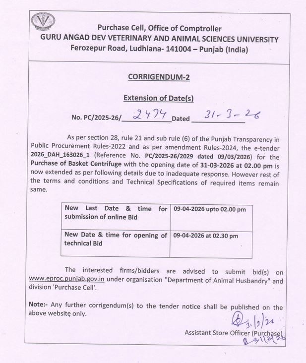 Corrigendum 2 for Extension of dates of e tender for the purchase of Basket Centrifuge, Assistant Store Officer, Purchase Cell, O/o Comptroller, GADVASU, Ludhiana