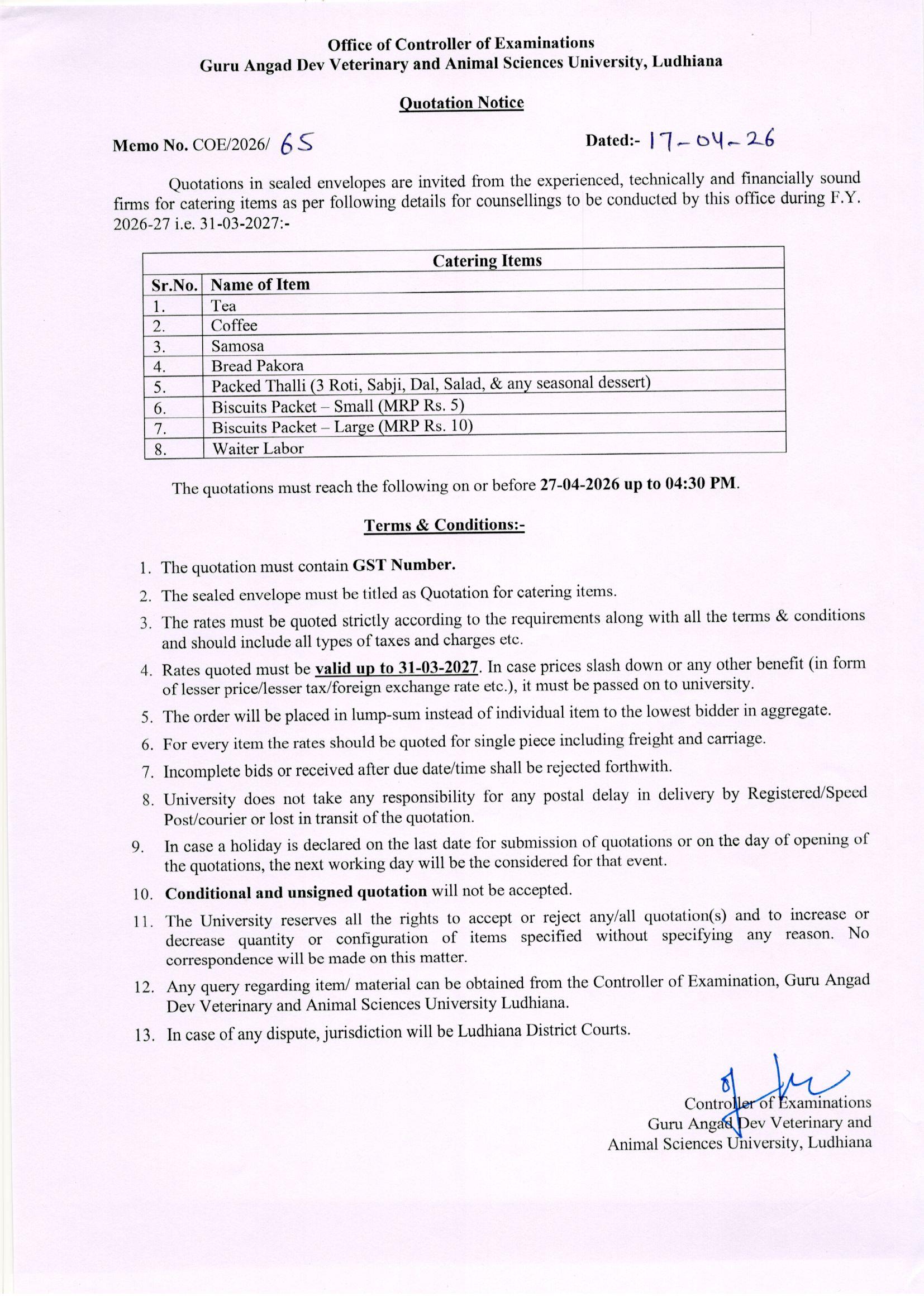 Quotation notice for Catering Items, Office of Controller of Examinations, Guru Angad Dev Veterinary & Animal Sciences University, Ludhiana