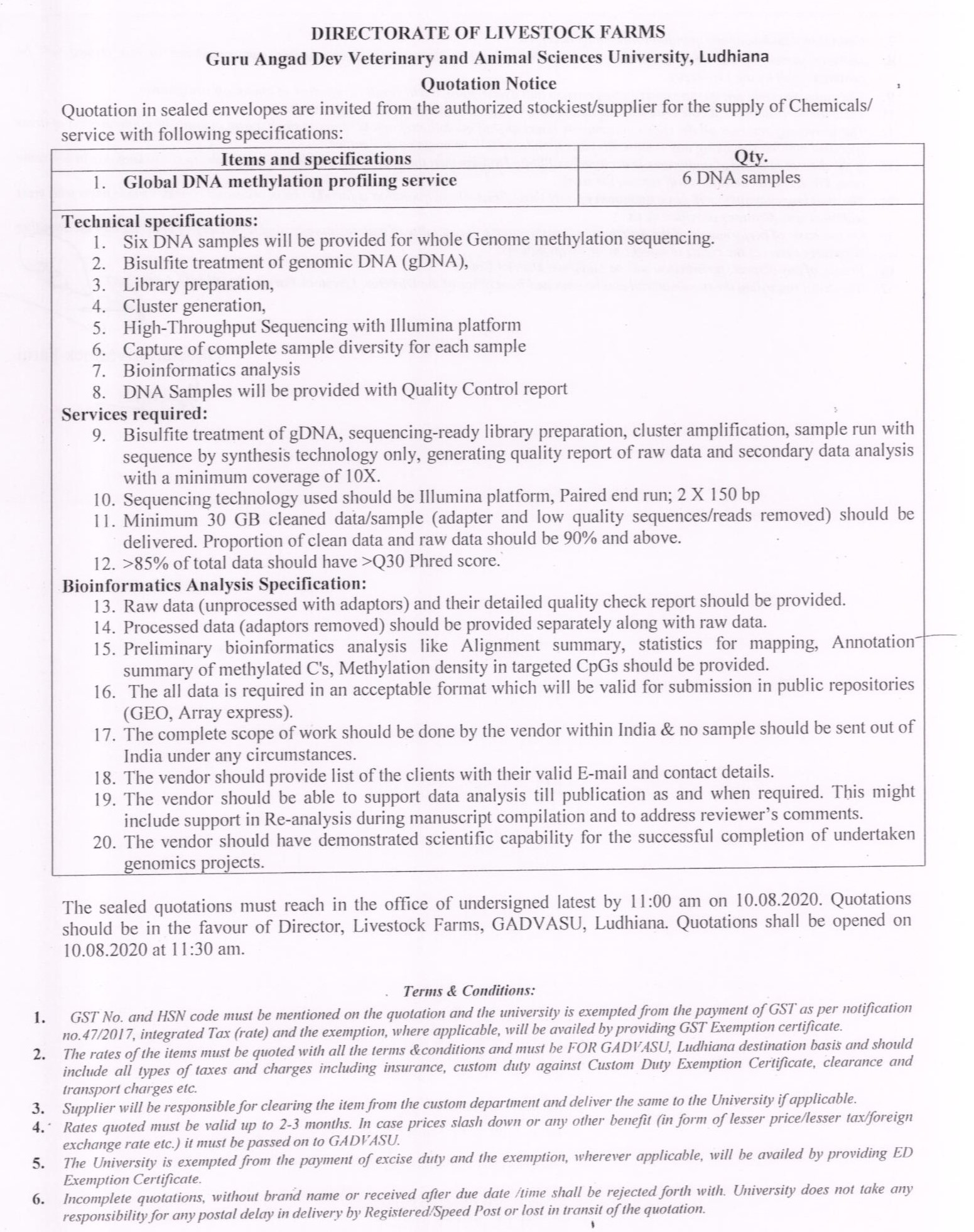 Quotation notice for the purchase of Global DNA methylation profiling service, Director Livestock Farms, GADVASU, Ludhiana