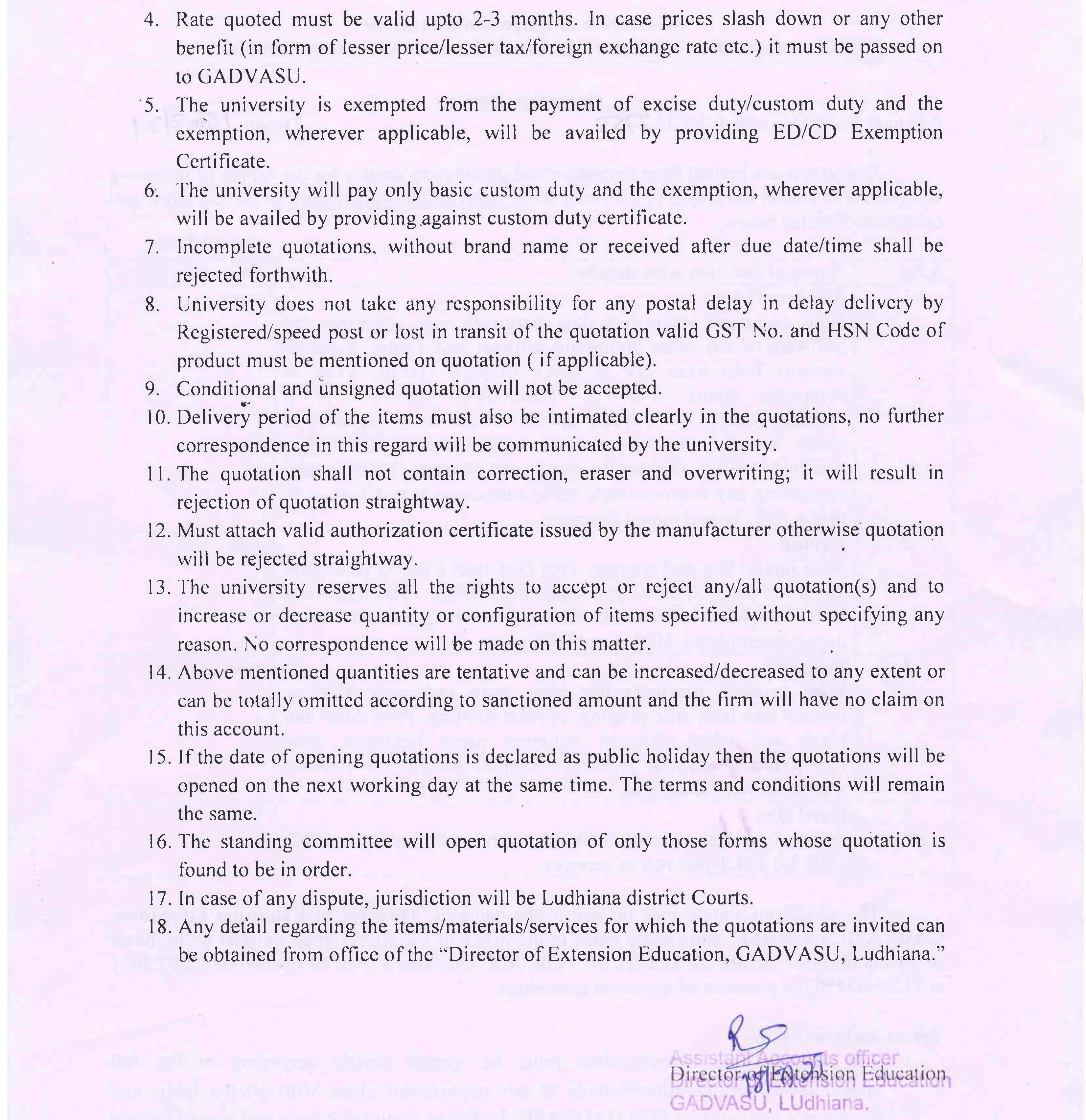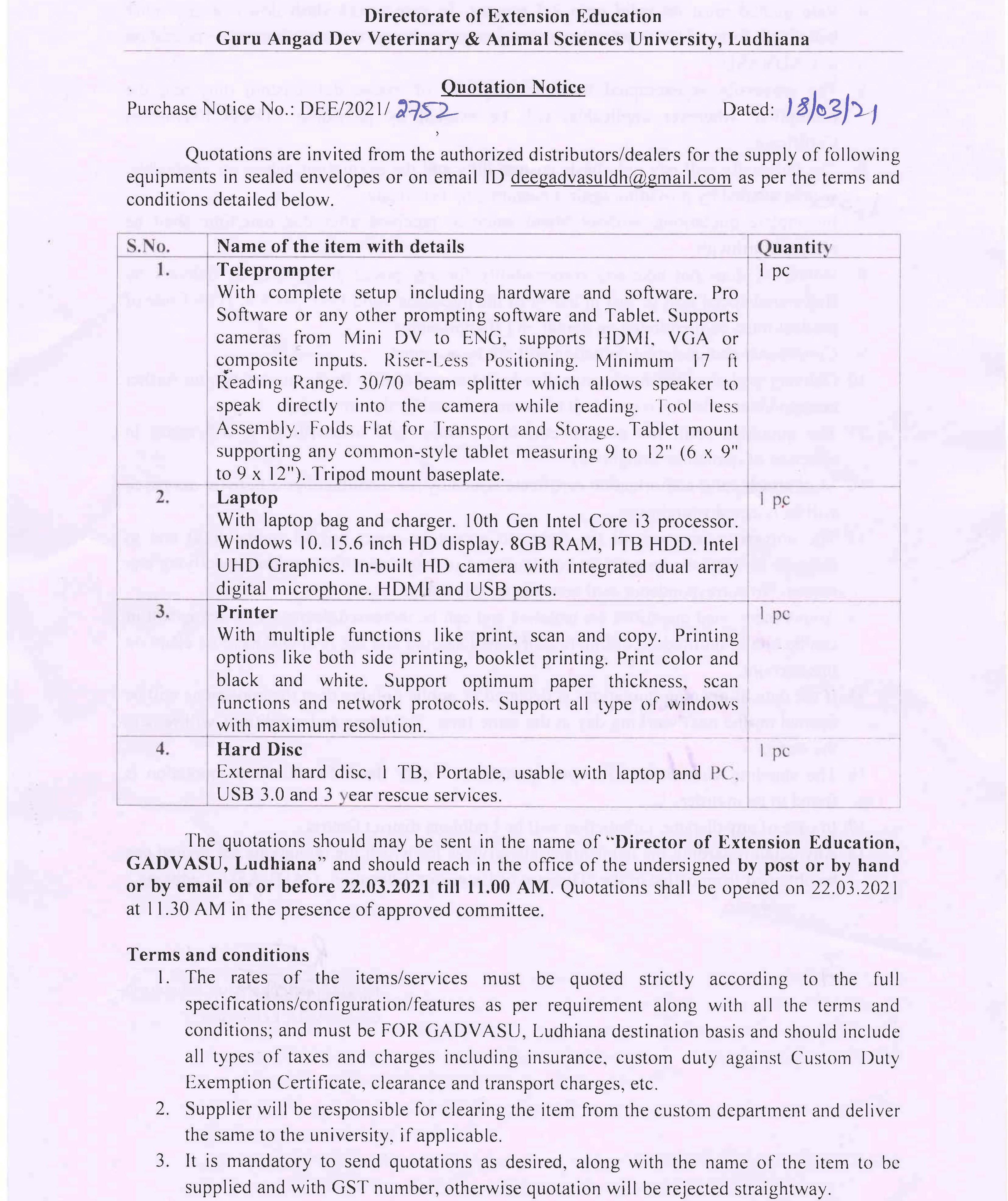 Quotation notice for the supply of various equipments, AAO, Director of Extension Education, GADVASU, Ludhiana