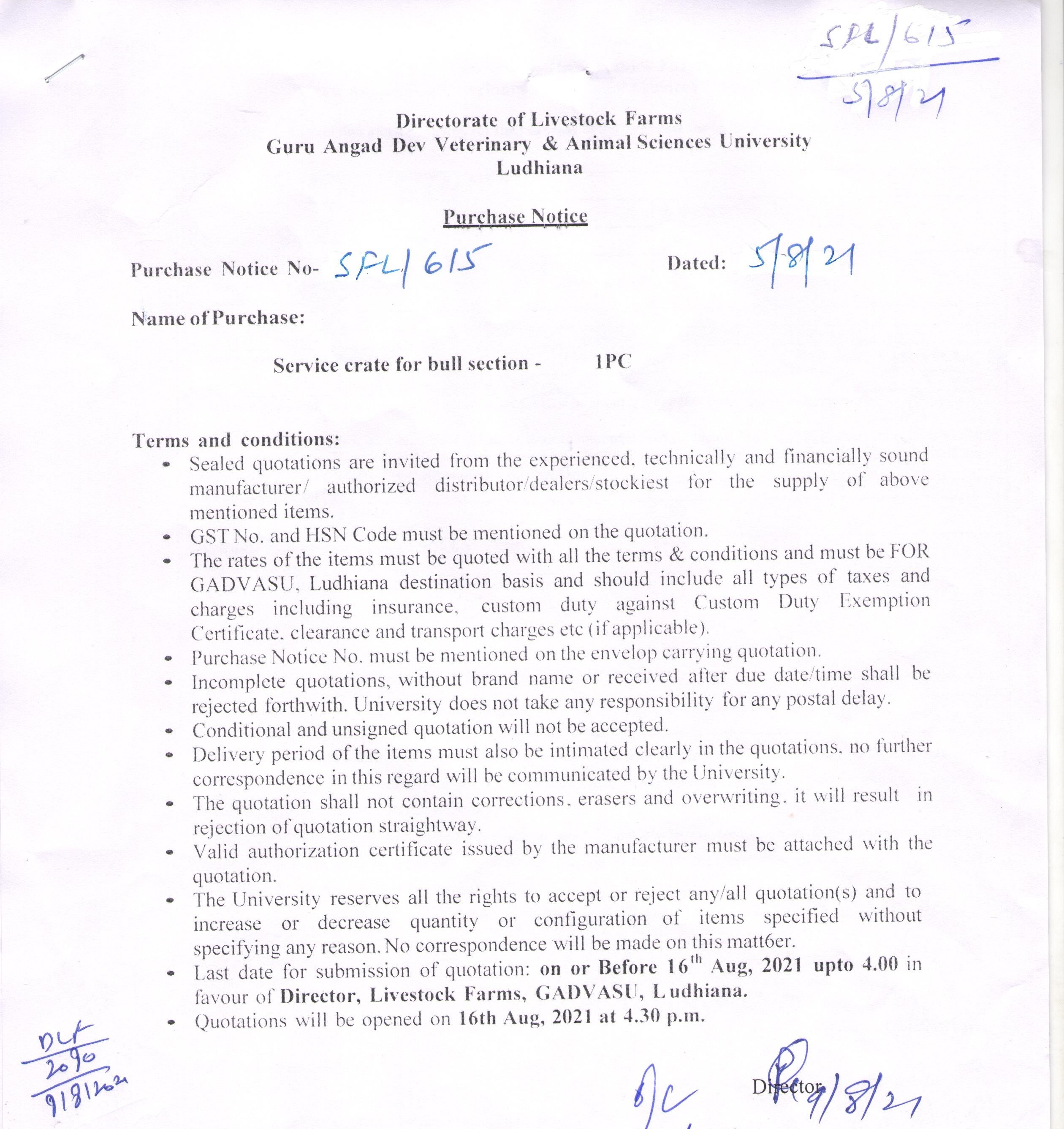 Quotation notice for the purhase of service crate for bull section, Directorate of Livestock Farms, GADVASU, Ludhiana