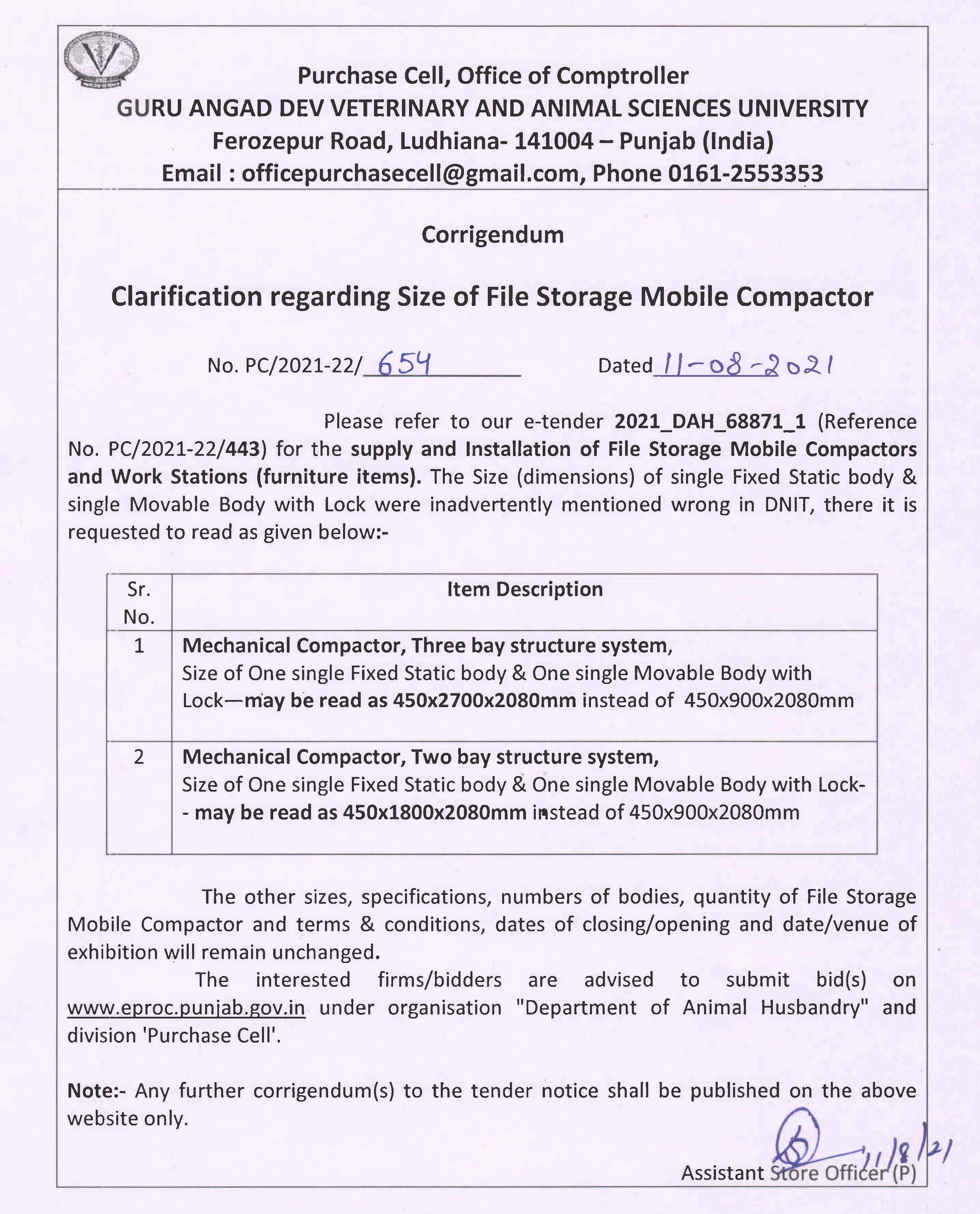 Corrigendum for e-Tender Notice for the Purchase of File Storage Mobile Compactors and Work Stations, O/o Purchase Cell, Comptroller, GADVASU, Ludhiana