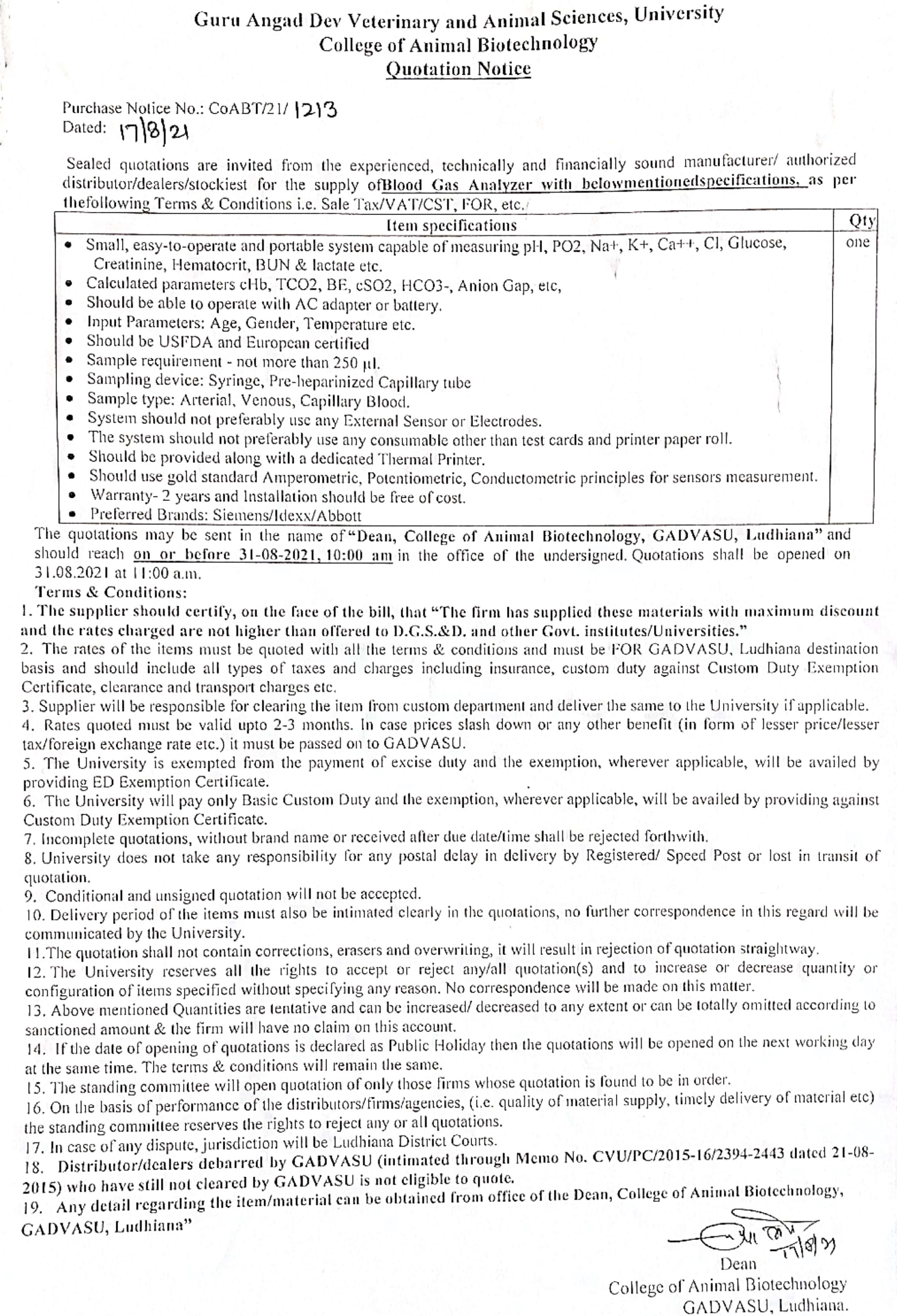 Quotation notice for the supply of Blood Gas Analyzer, Dean, College of Animal Biotechnology, GADVASU, Ludhiana