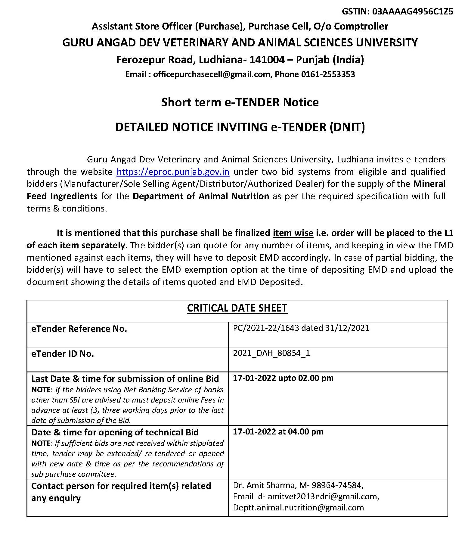Short term e-Tender Notice for the Purchase of Mineral Feed Ingredients, O/o Purchase Cell, Comptroller, GADVASU, Ludhiana