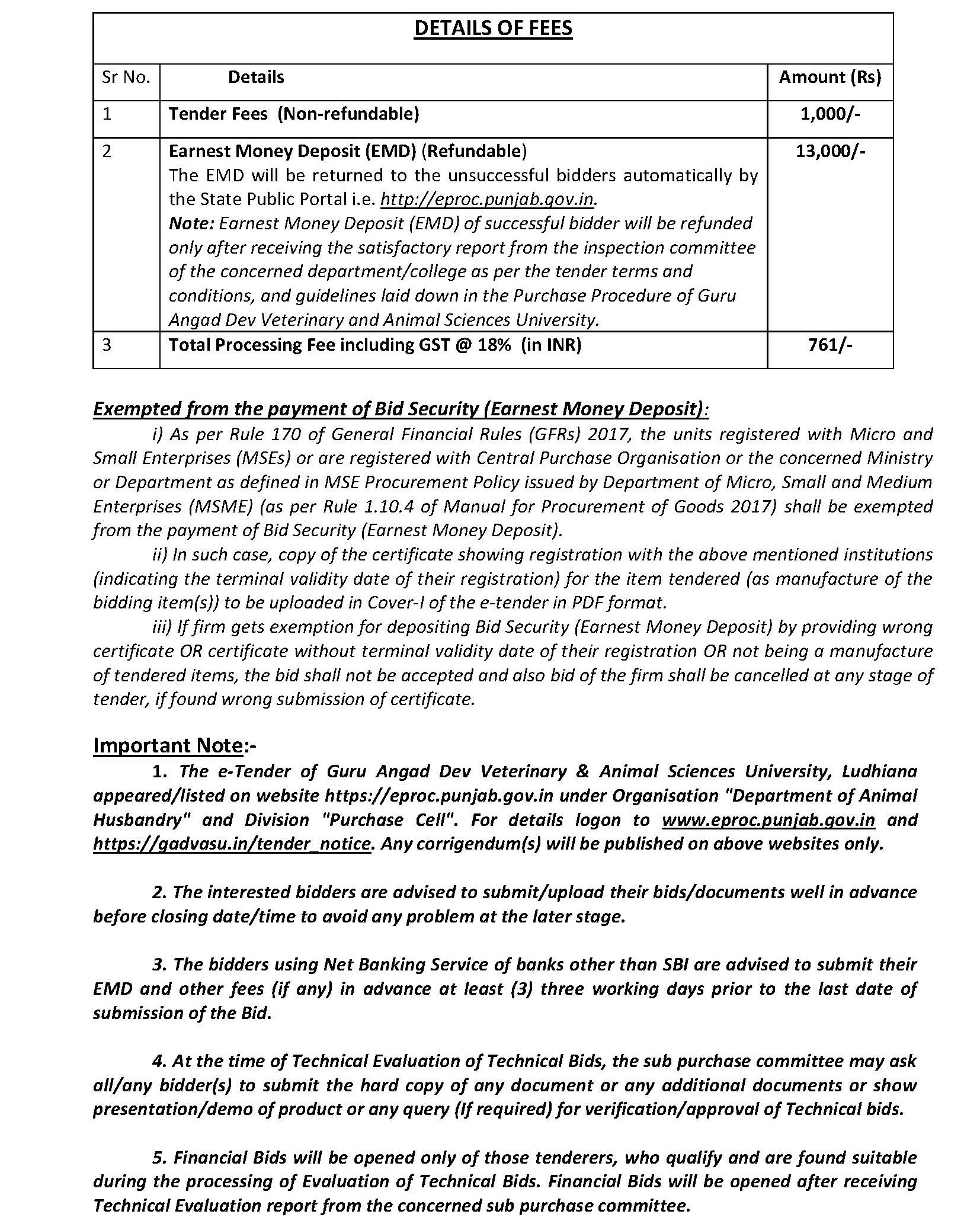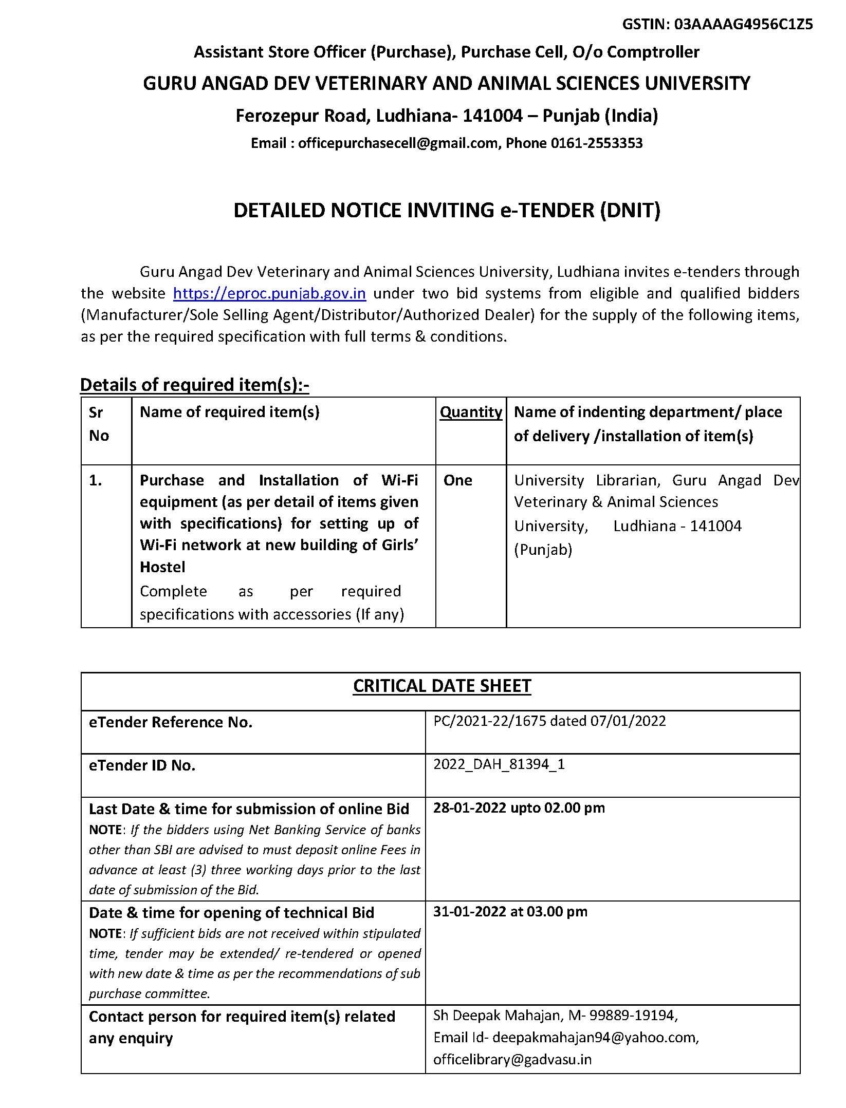 e-Tender Notice for the Purchase and Installtion of Wi-Fi Equipment, Assistant Store Officer (Purchase), Purchase Cell, O/o Comptroller, GADVASU, Ludhianaa