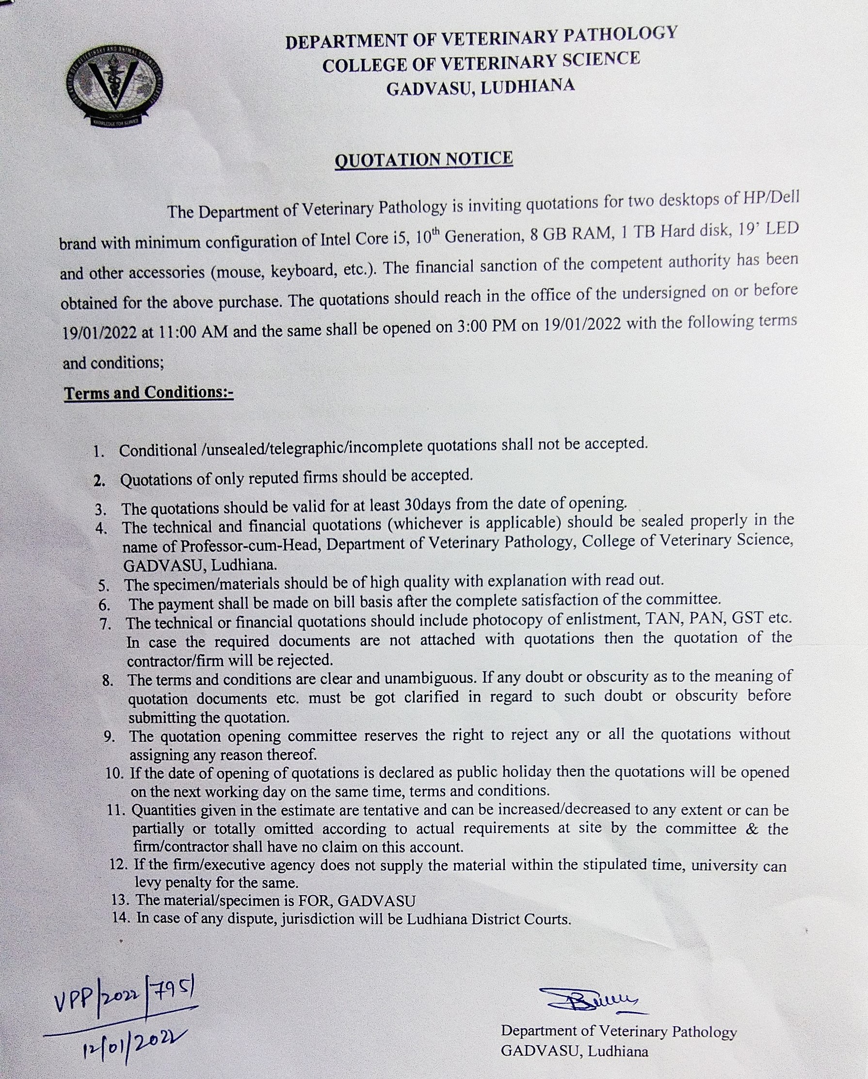 Quotation notice for the purchase of two Desktops, Professor-cum-Head, Department of Veterinary Pathology, COVS, GADVASU, Ludhiana