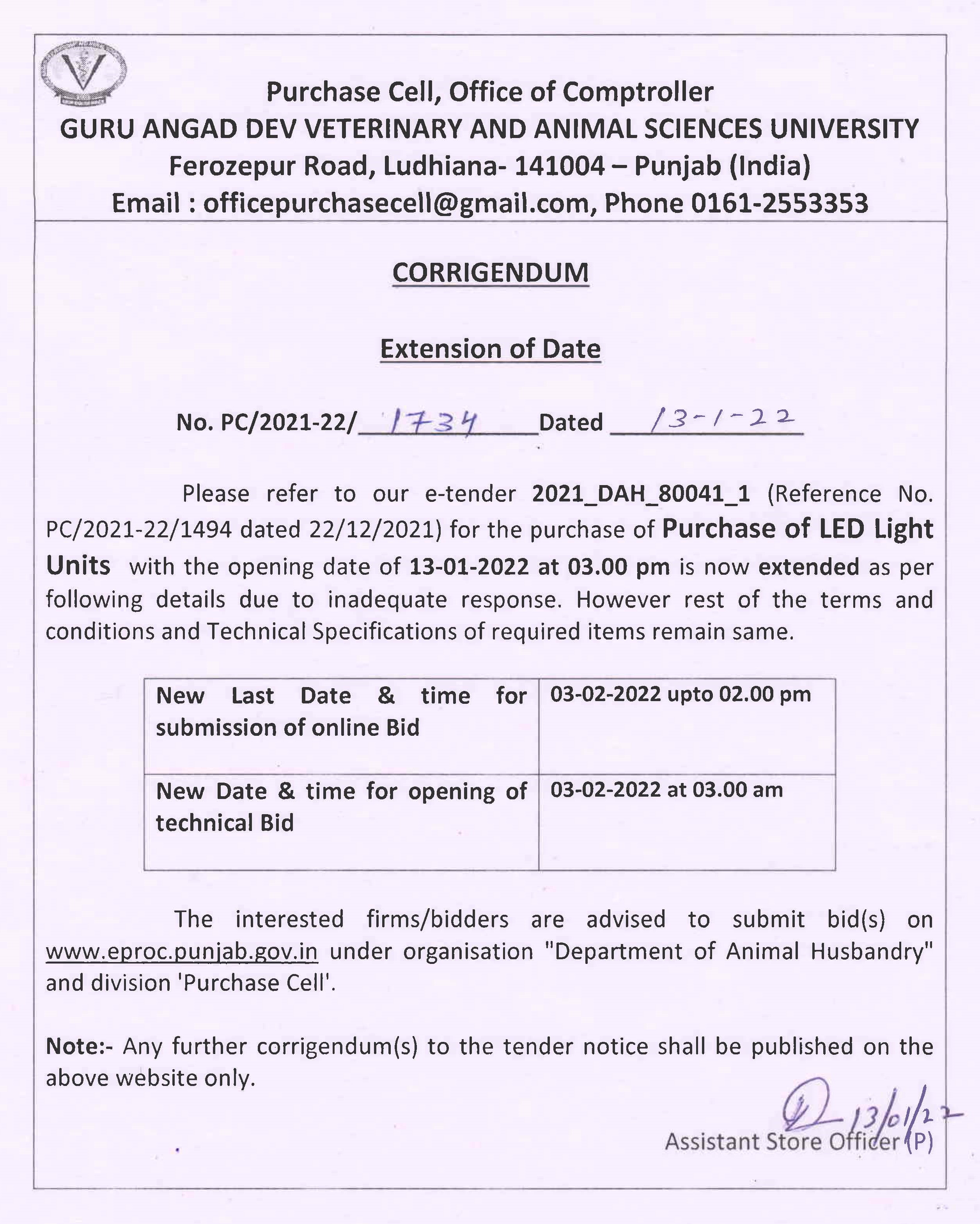 Corrigendum for the extension of last date for the purchase of LED Light Units, Assistant Store Officer, O/o Purchase Cell, Comptroller, GADVASU, Ludhiana