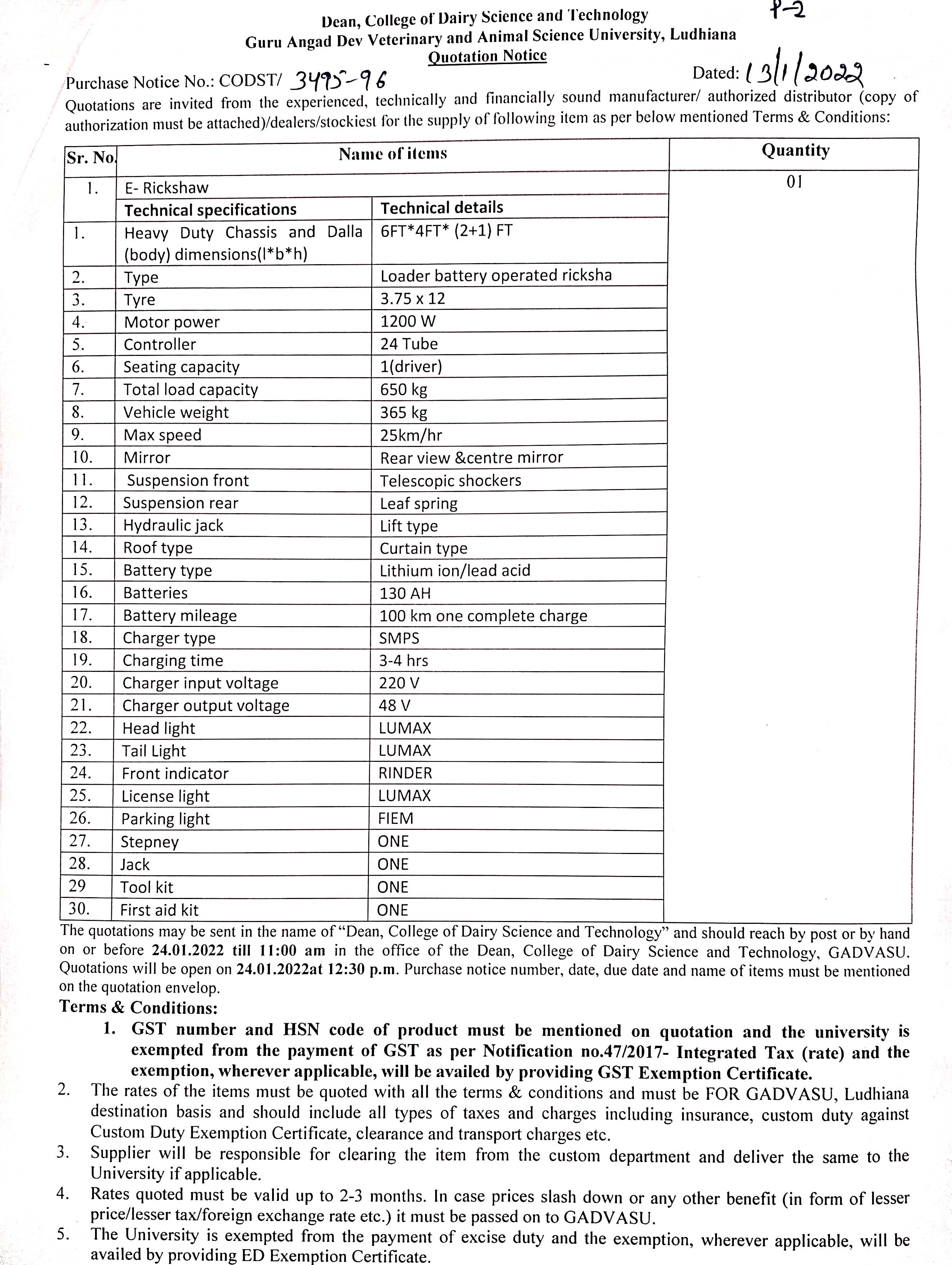Quotation notice for the supply of E-Rickshaw, Dean, College of Dairy Science and Technology, GADVASU, Ludhiana