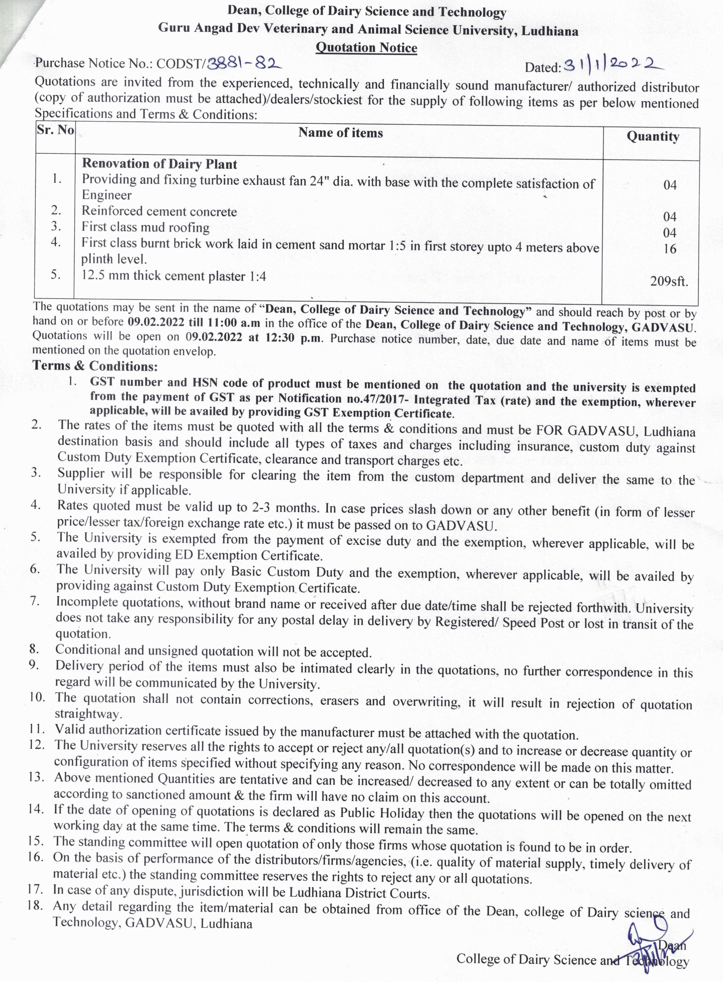 Quotation notice for the Renovation of Dairy Plant , Dean, College of Dairy Science and Technology, GADVASU, Ludhiana