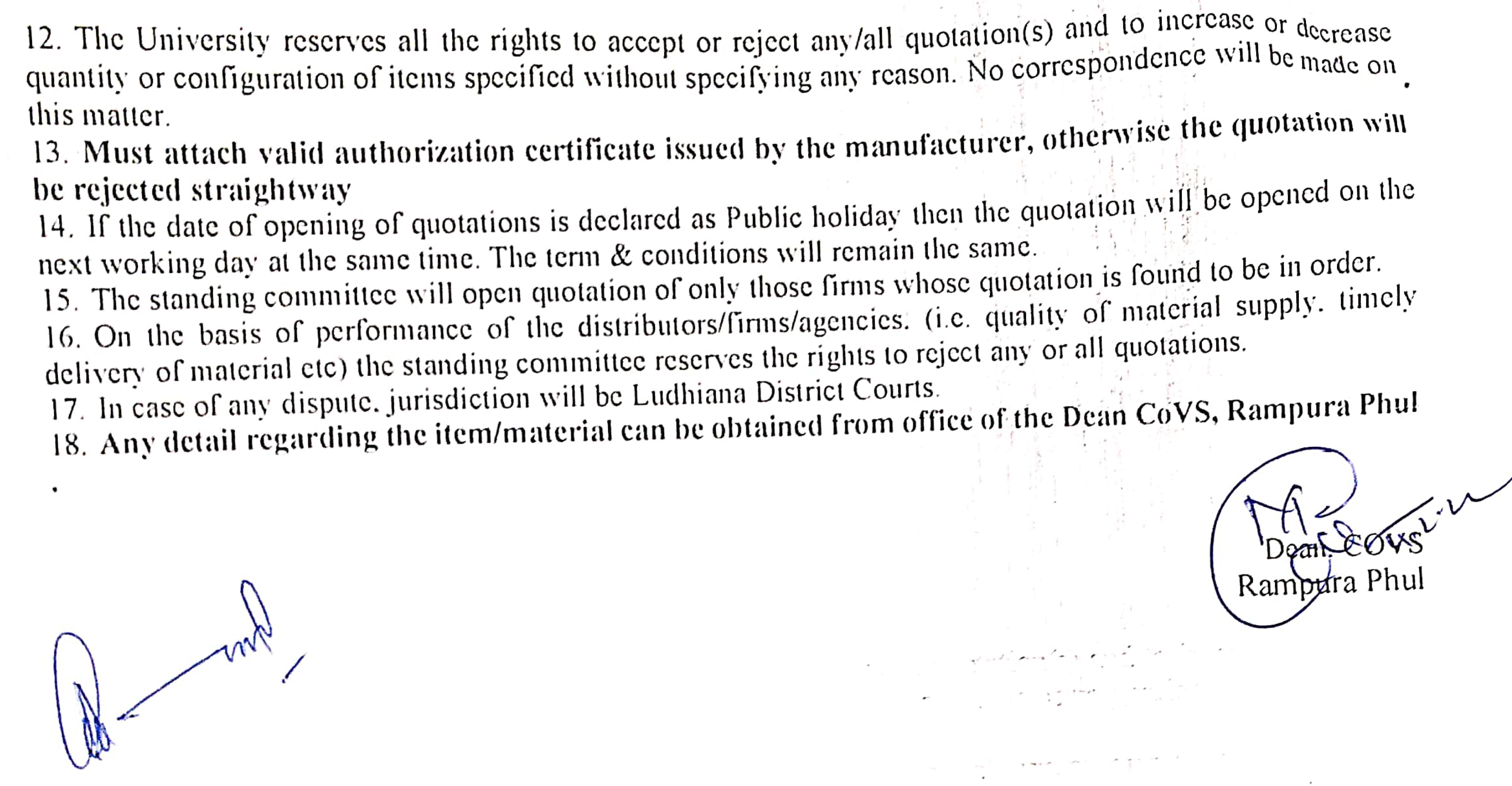 Quotation notice for the supply of Obstetrical Instruments, Dean, College of Veterinary Science, GADVASU, RampuraPhul