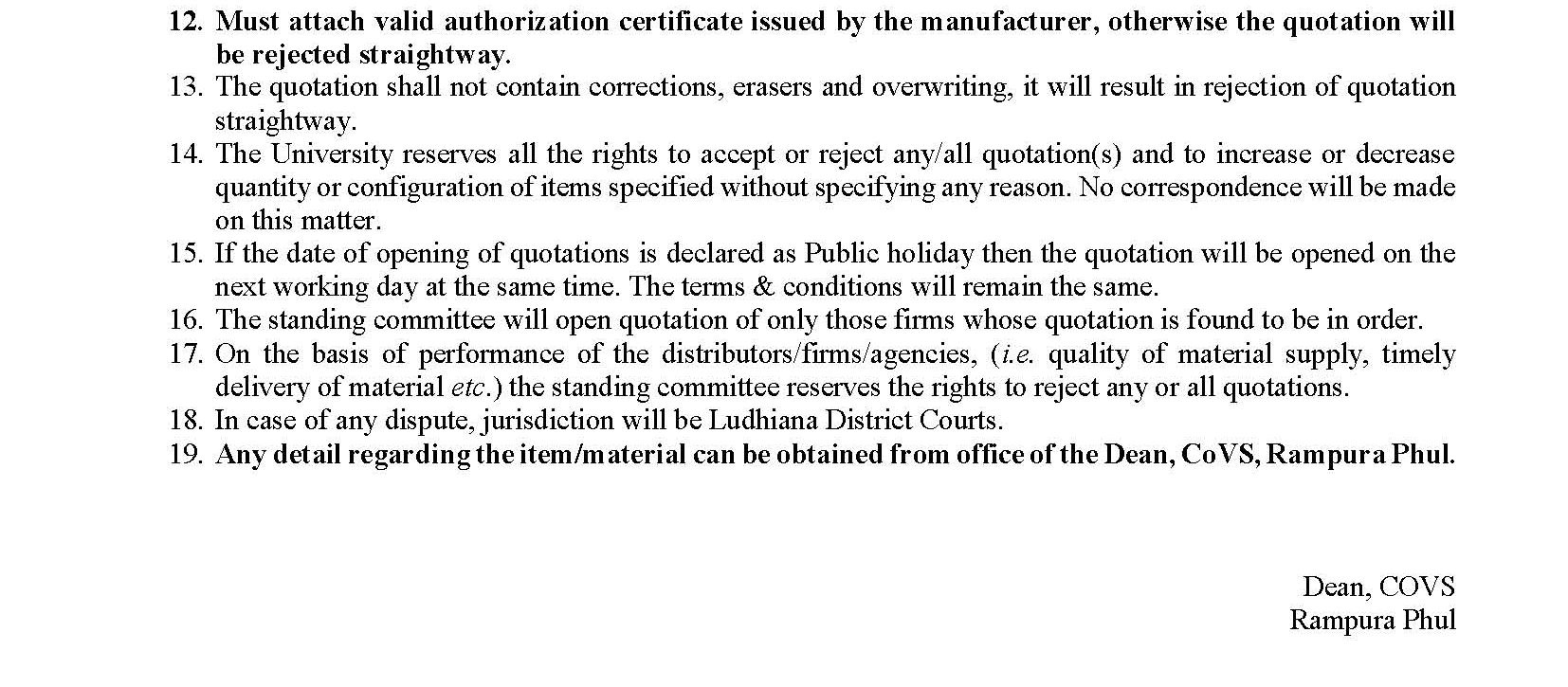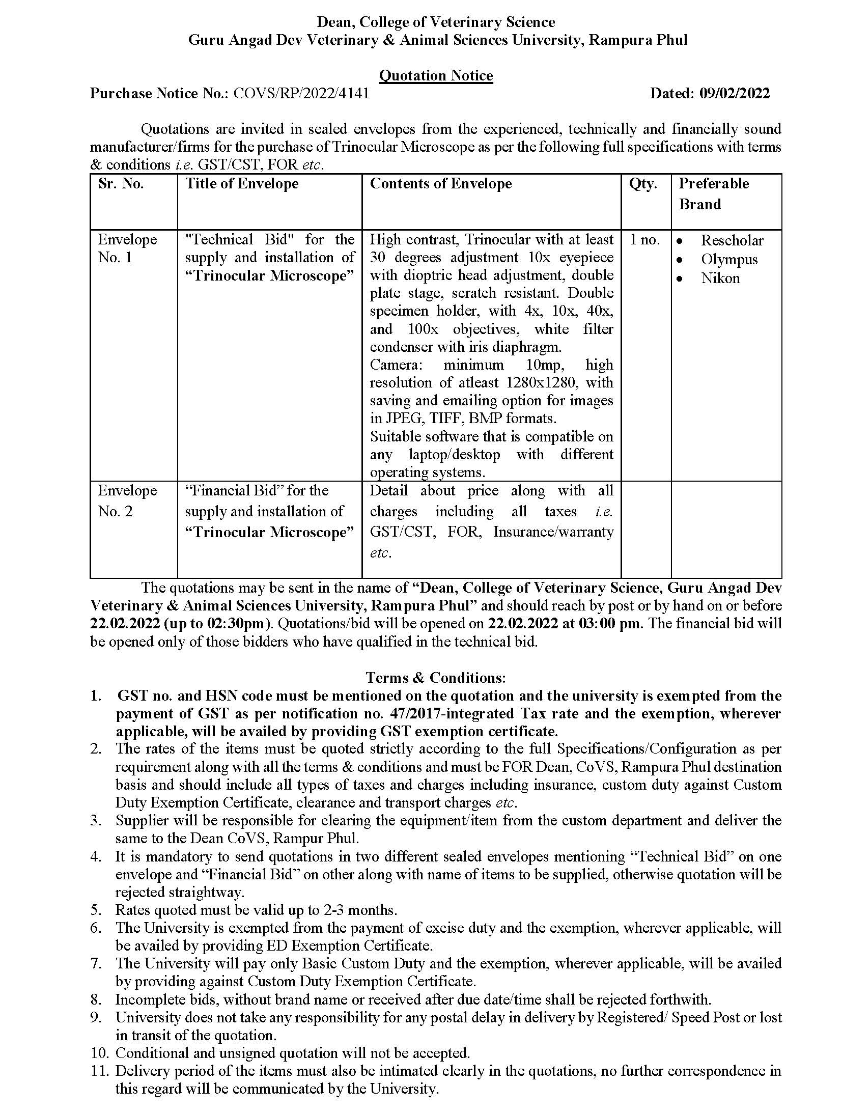 Quotation notice for the purchase of Trinocular Microscope, Dean, College of Veterinary Science, GADVASU, Rampura Phul