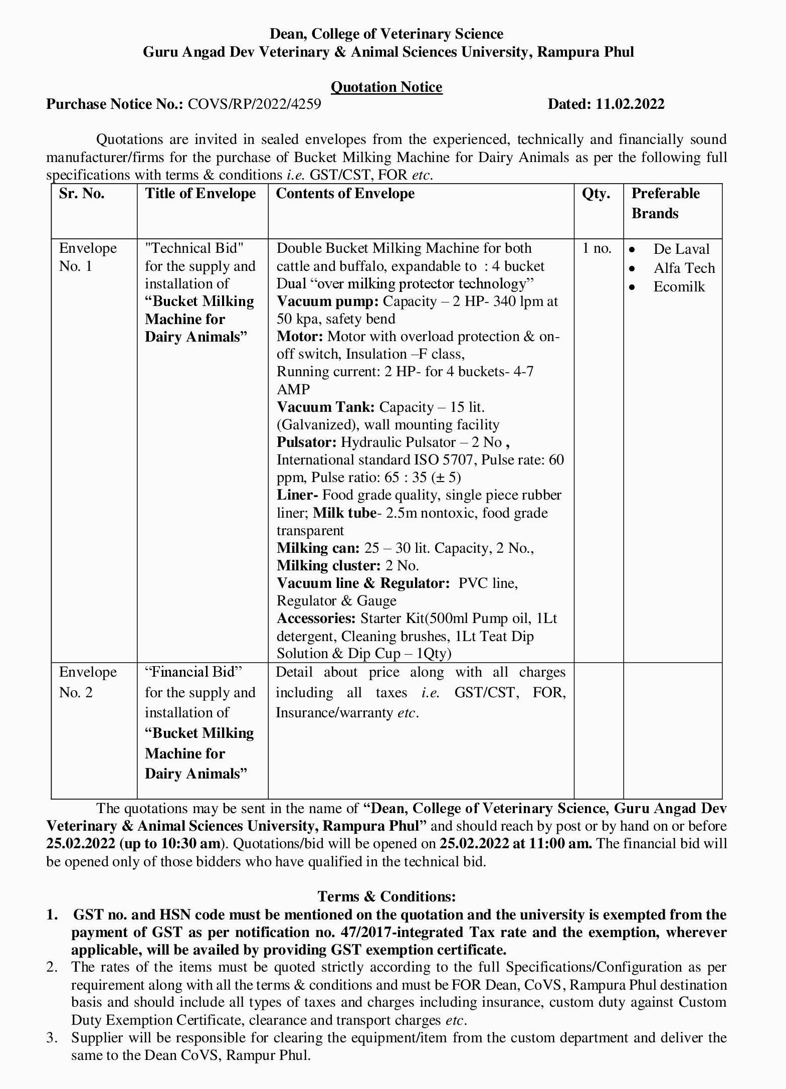 Quotation notice for the purchase of Bucket Milking Machine, Dean, College of Veterinary Science, GADVASU, Rampura Phul