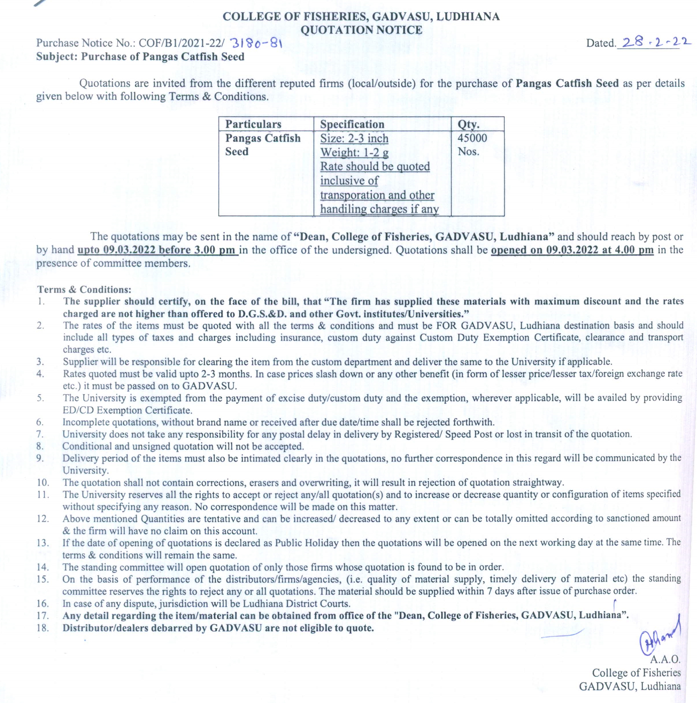 Quotation notice for the purchase of Pangas Catfish Seed, Dean, College of Fisheries, GADVASU, Ludhiana