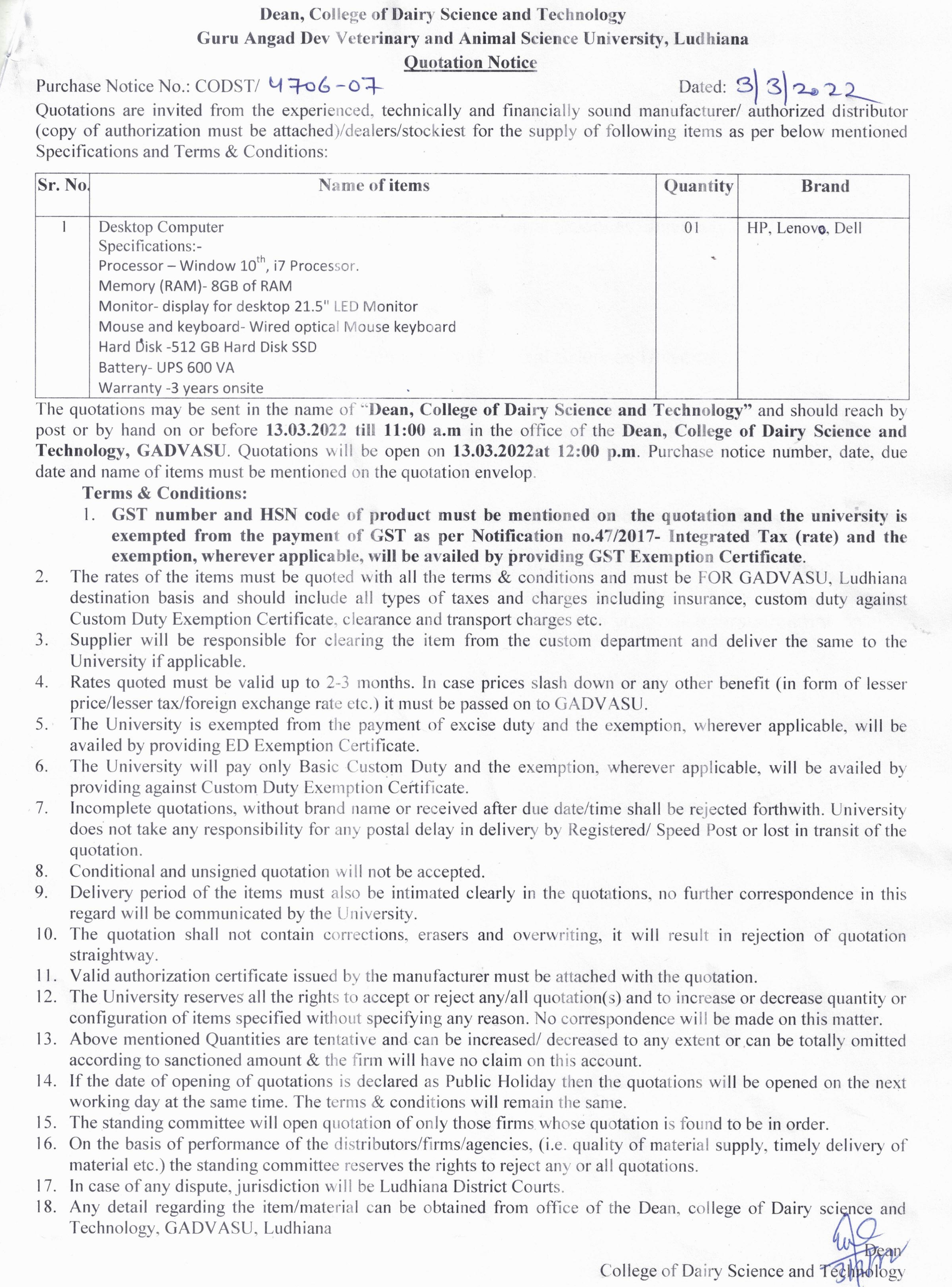 Quotation Notice for the Purchase of Desktop Computer, Dean, College of Dairy Science and Technology, GADVASU, Ludhiana