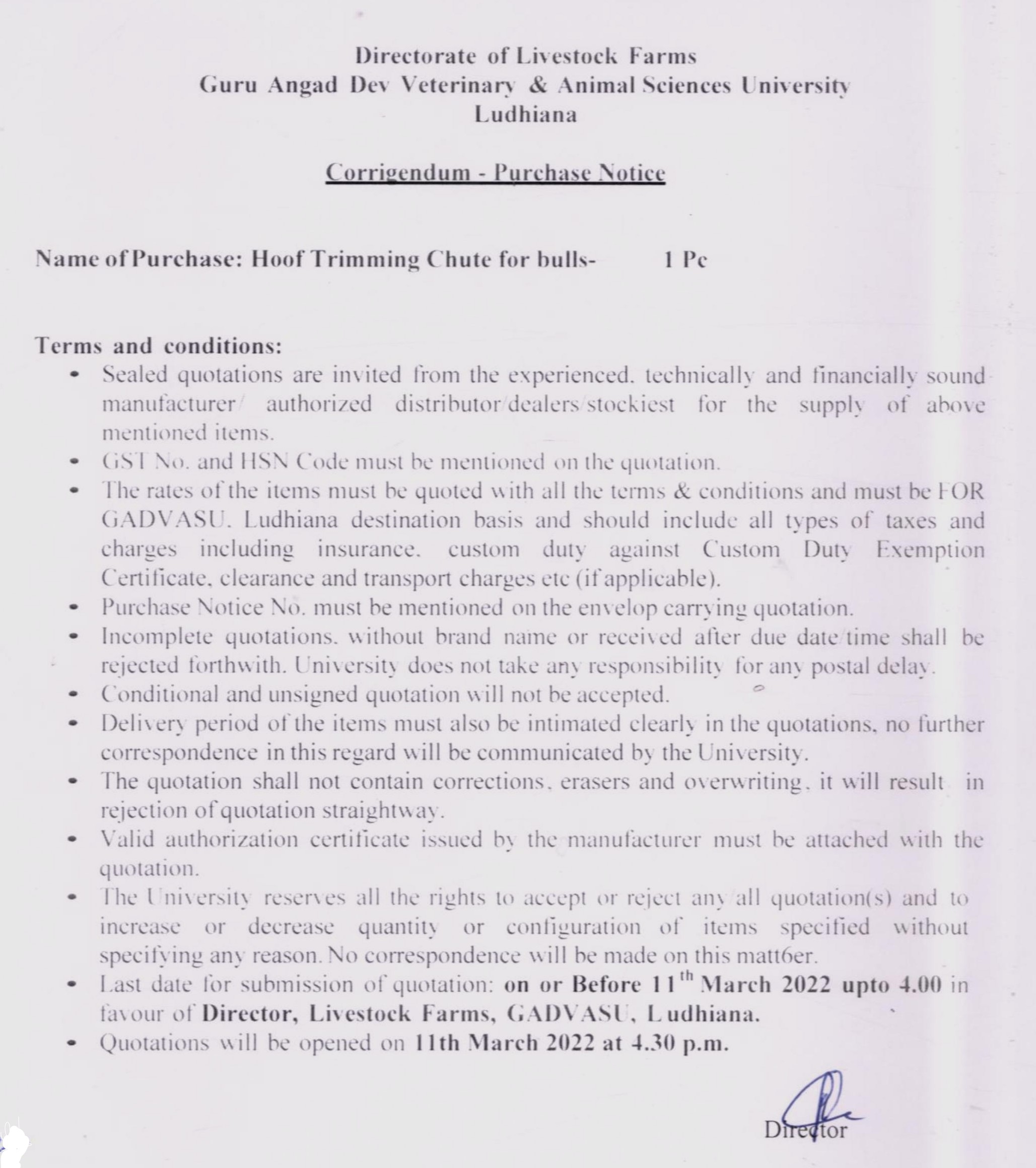Quotation notice for the purchase of Hoof Trimming Chute for bulls, Directorate of Livestock Farms, GADVASU, Ludhiana