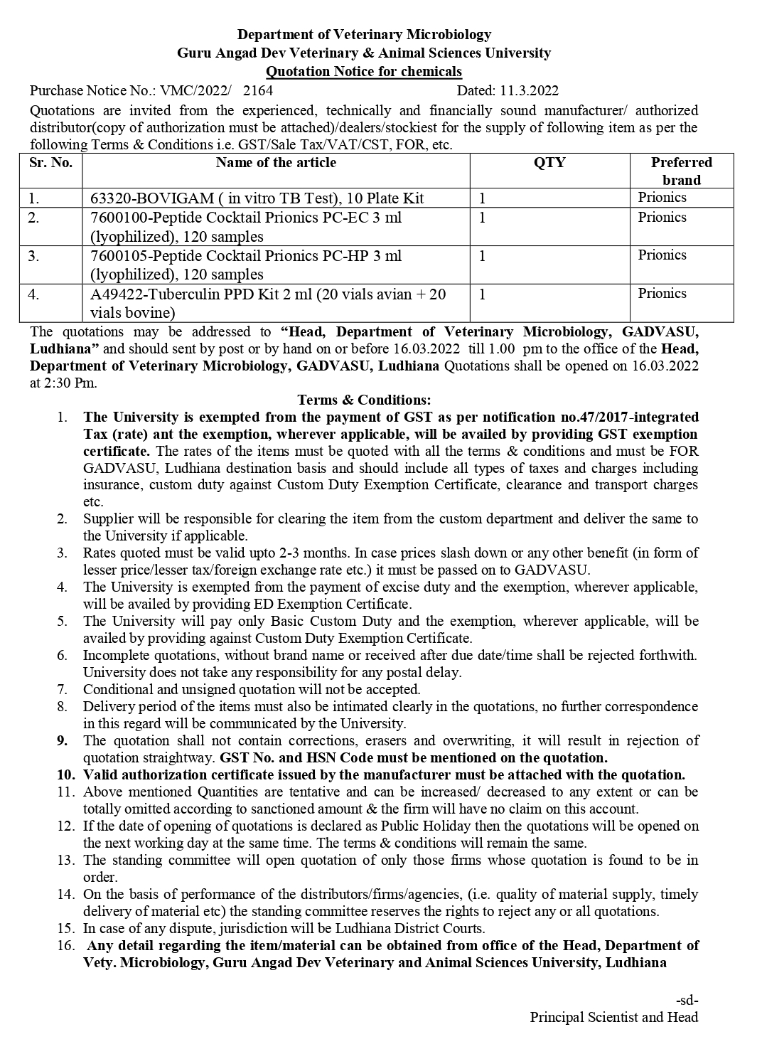 Quotation notice for the supply of Research kits, Head, Department of Veterinary Microbiology, GADVASU, Ludhiana