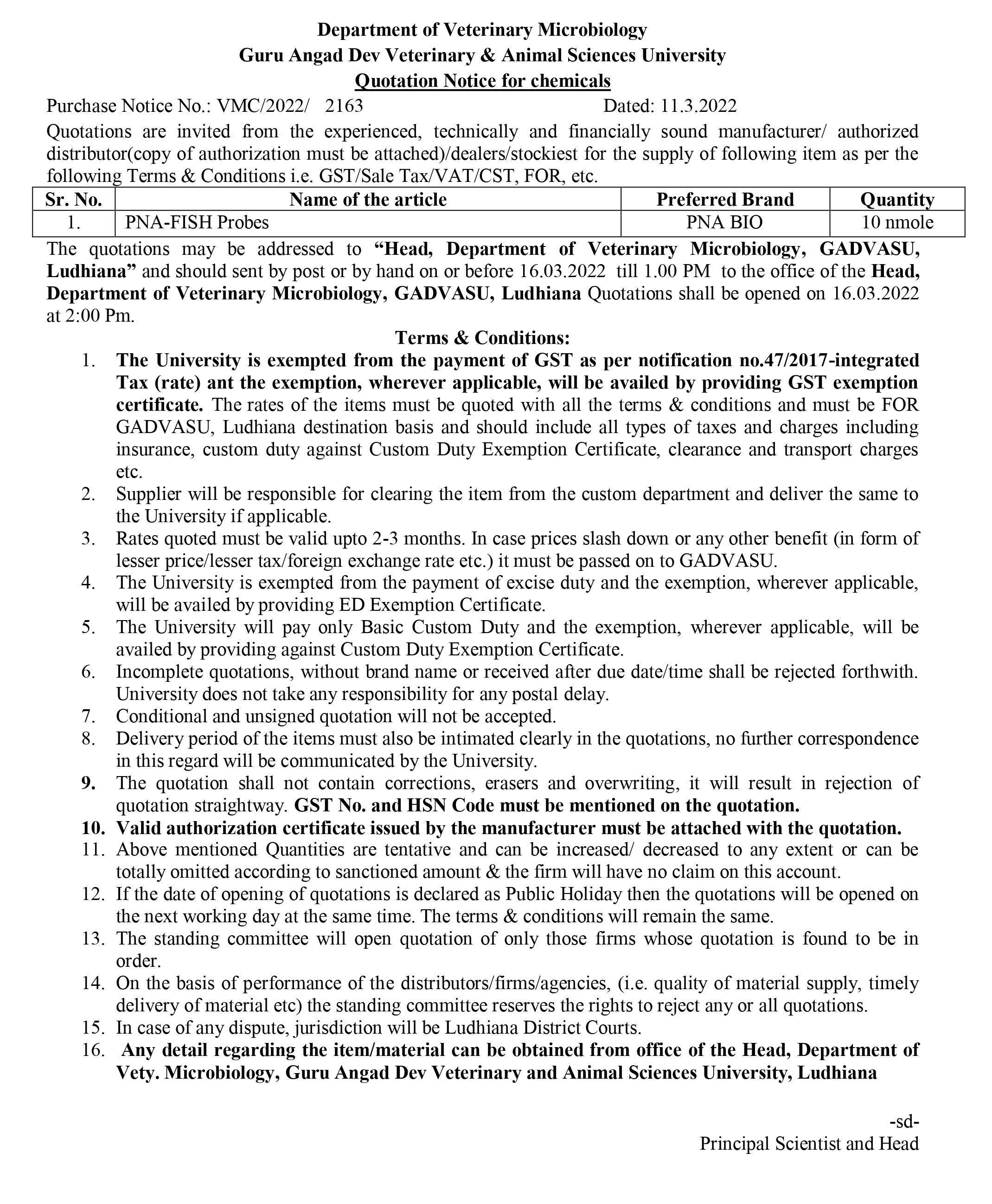 Quotation notice for the supply of PNA-FISH Probes, Head, Department of Veterinary Microbiology, GADVASU, Ludhiana