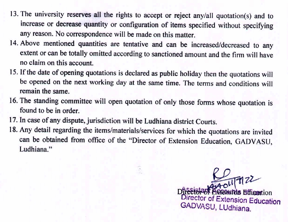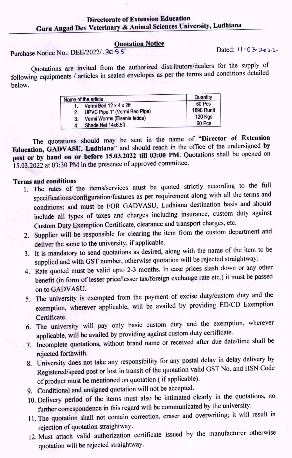 Quotation notice for the purchase of Vermibeds and other material for vermicomposting, Department of Director Extension Education, GADVASU, Ludhiana