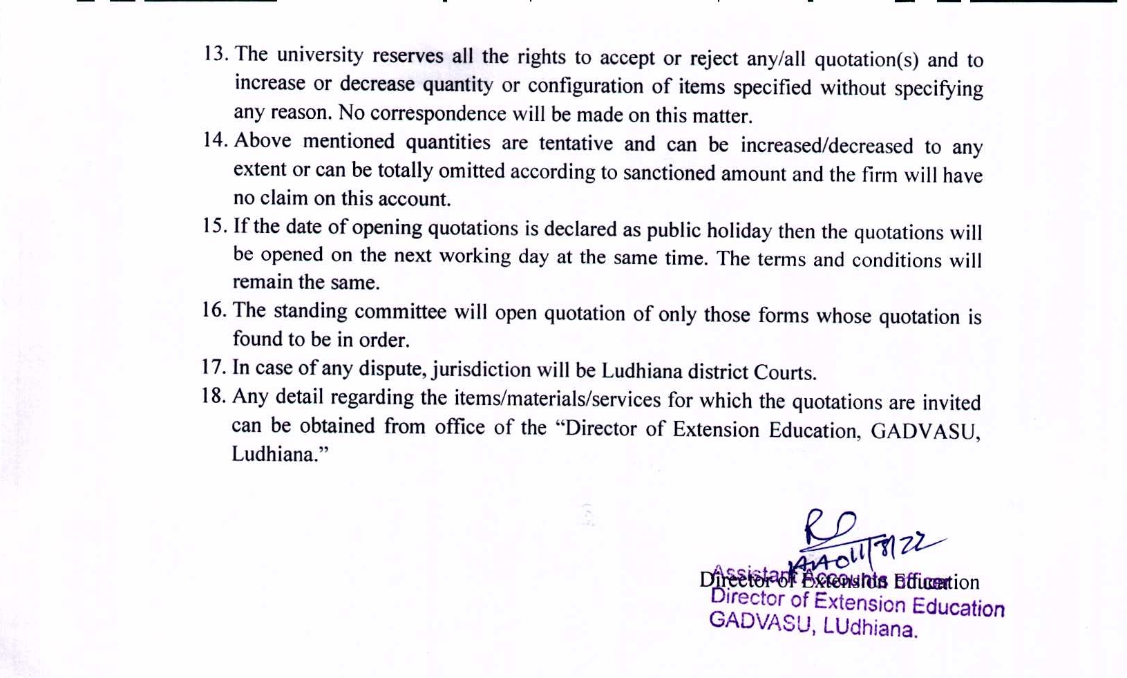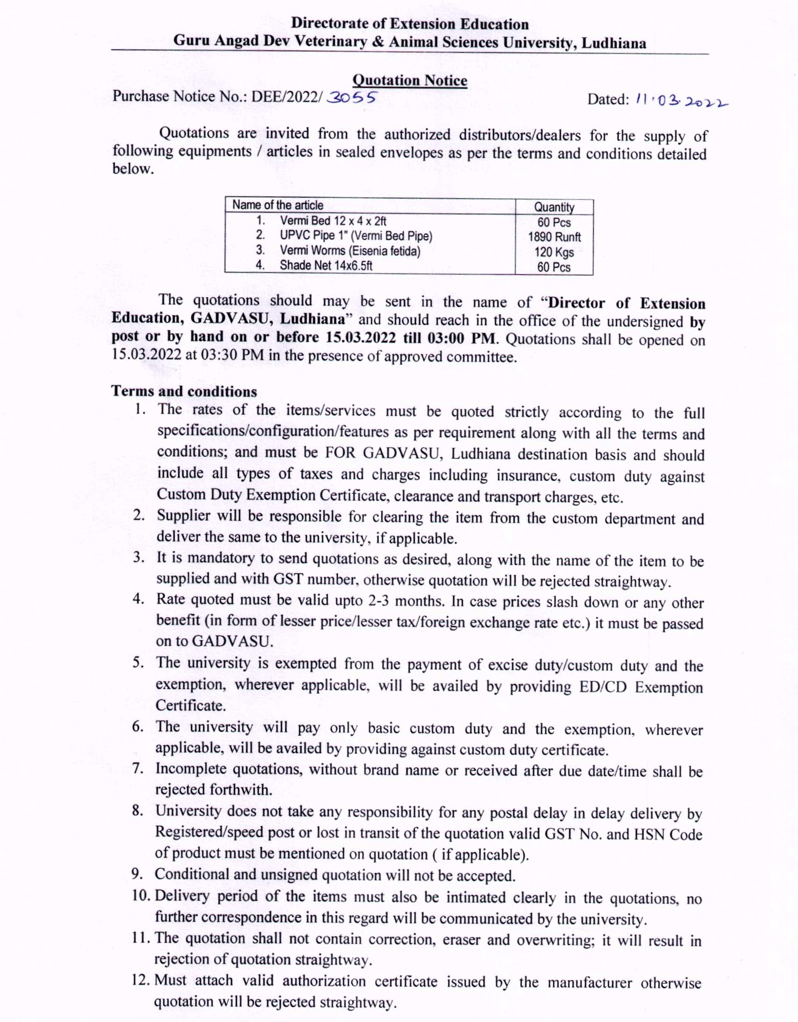 Quotation notice for the supply of various equipments, Directorate of Extension Education, GADVASU, Ludhiana