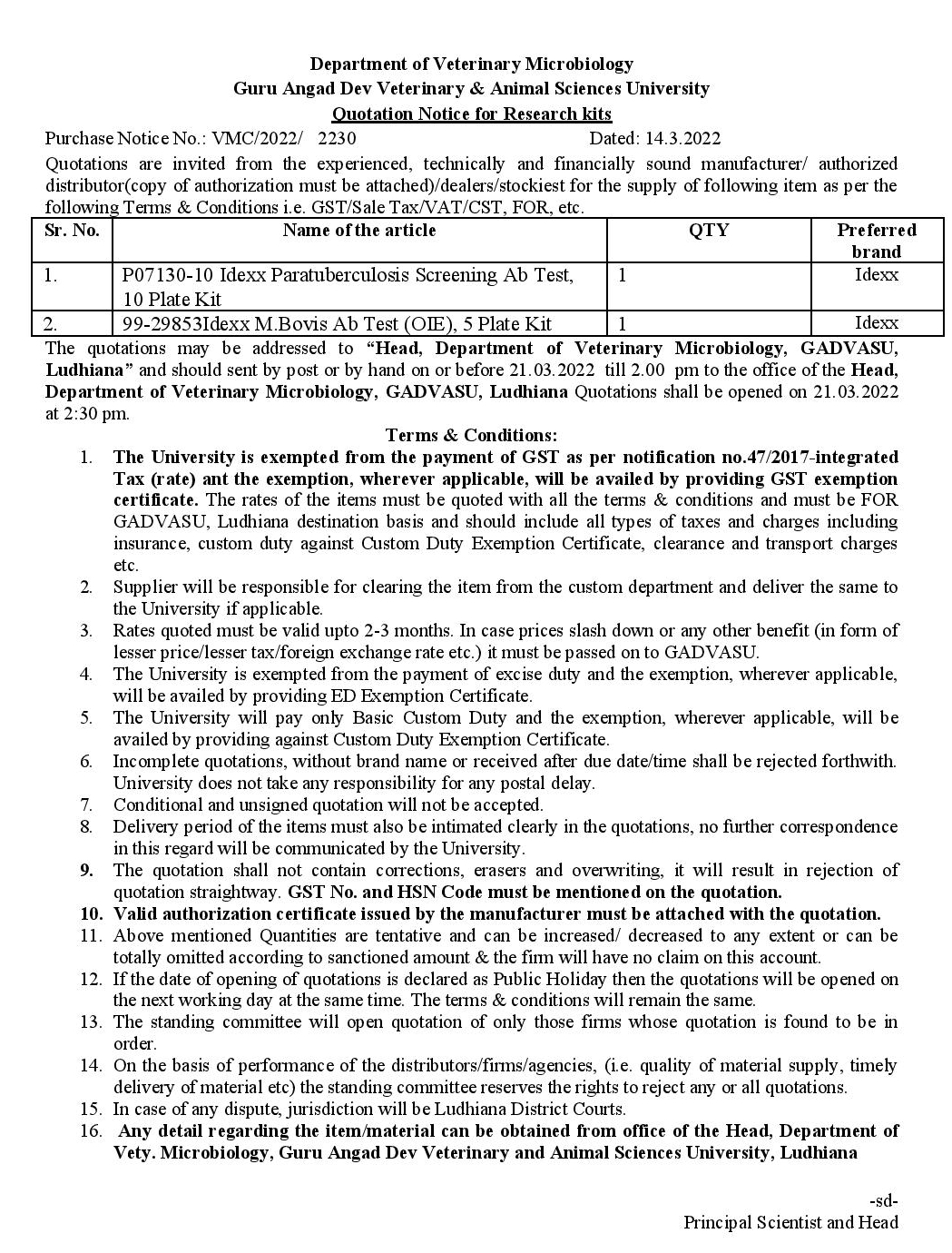 Quotation notice for Idexx Paratuberculosis Screening Ab Test Kit, Principal Scientist and Head, Department , Microbiology, GADVASU, Ludhiana