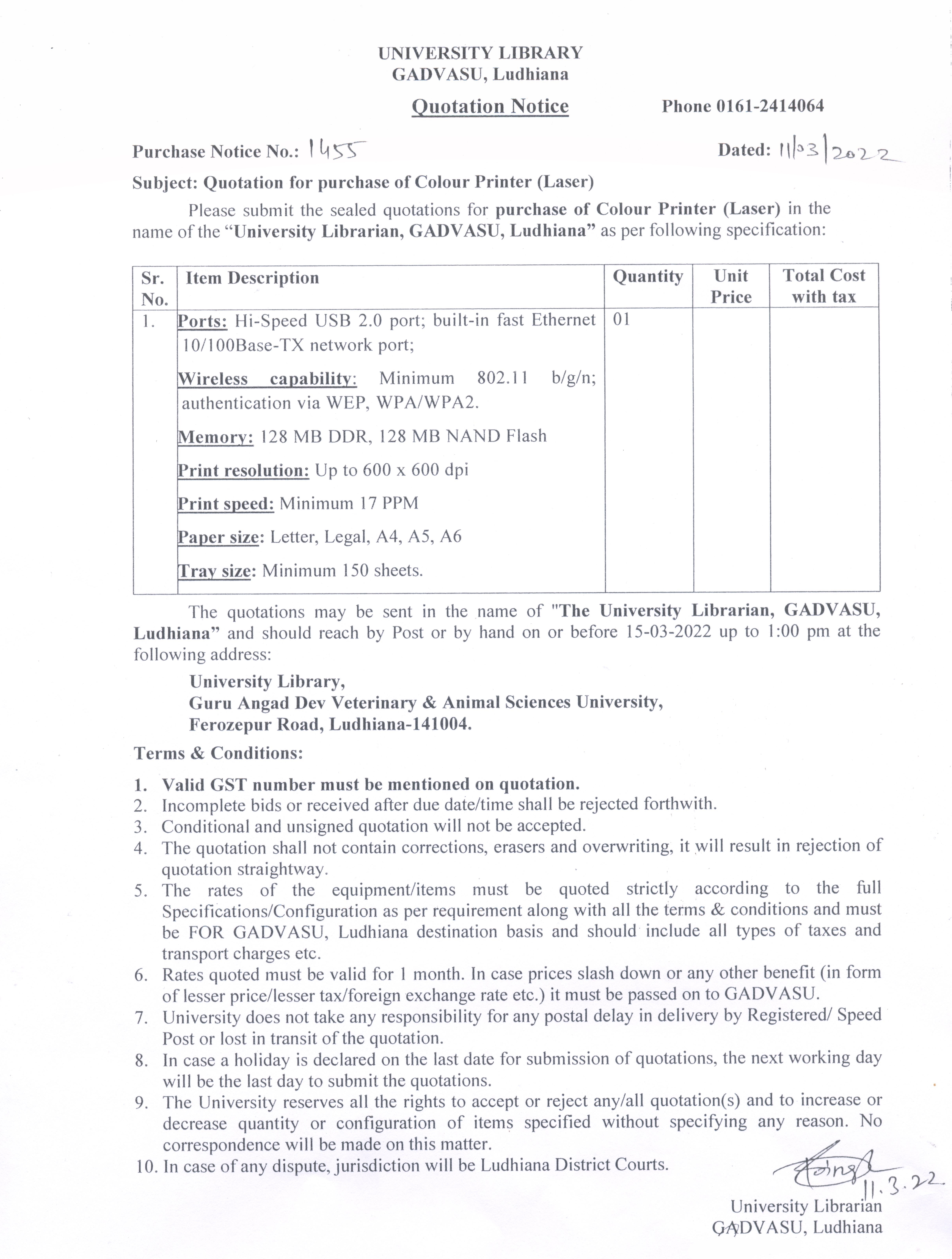 Quotation Notice for purchase of Colour Printer (Laser), University Library, GADVASU, Ludhiana