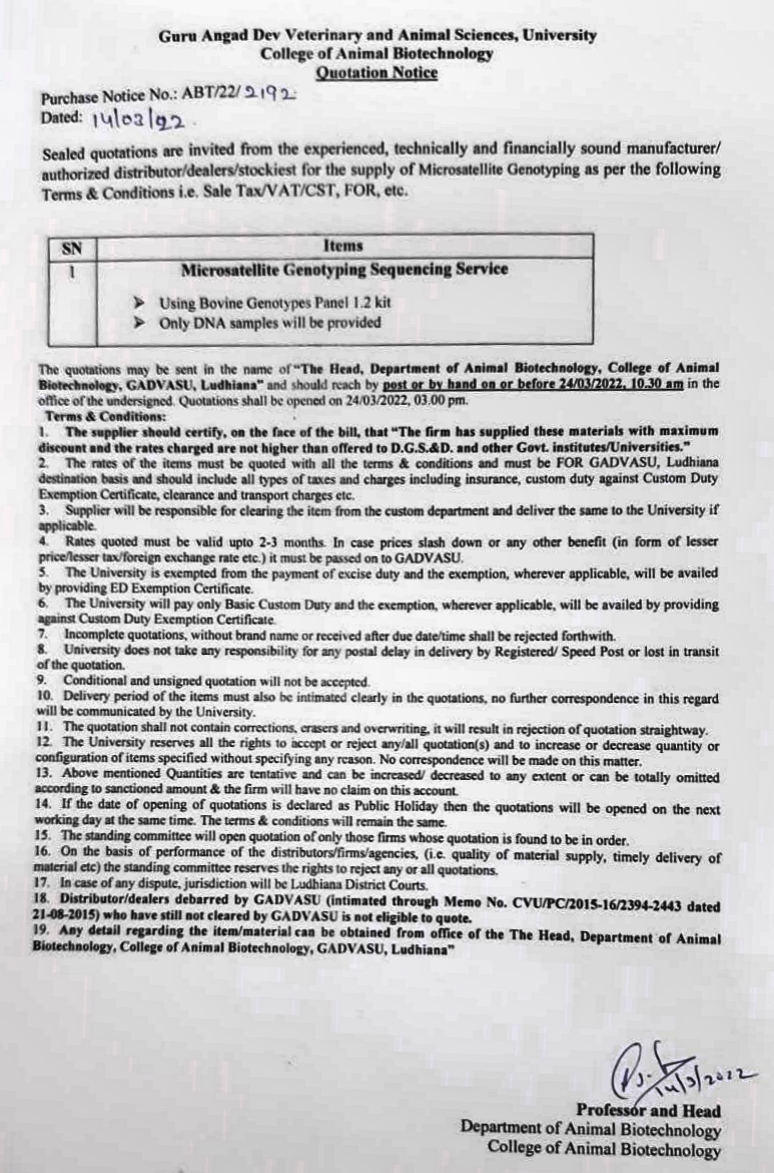 Quotation notice for the Supply of Microsatellite Genotyping, Professor and Head Department of Animal Biotechnology, GADVASU, Ludhiana