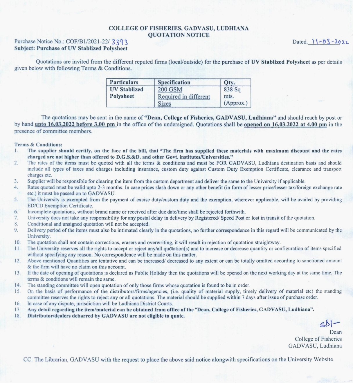 Quotation notice for the purchase of UV Stablized Polysheet, Dean, College of Fisheries, GADVASU, Ludhiana