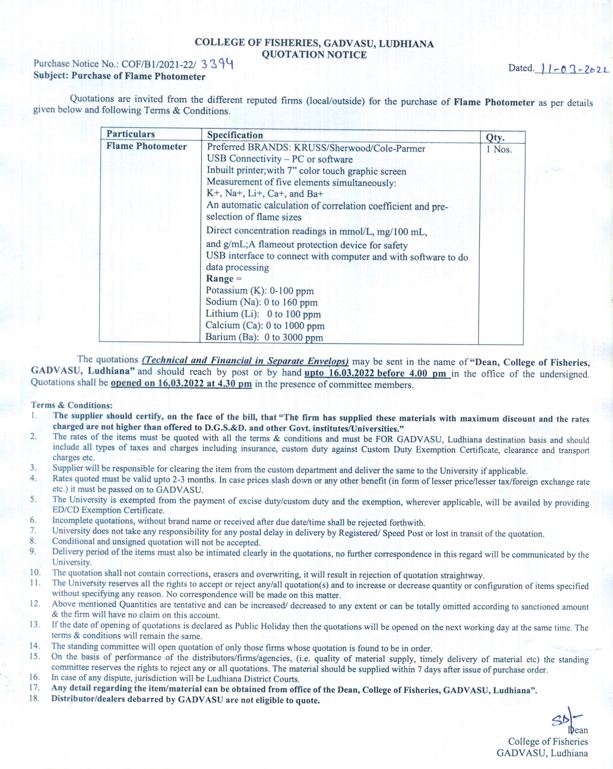 Quotation notice for the purchase of Flame Photometer, Dean, College of Fisheries, GADVASU, Ludhiana