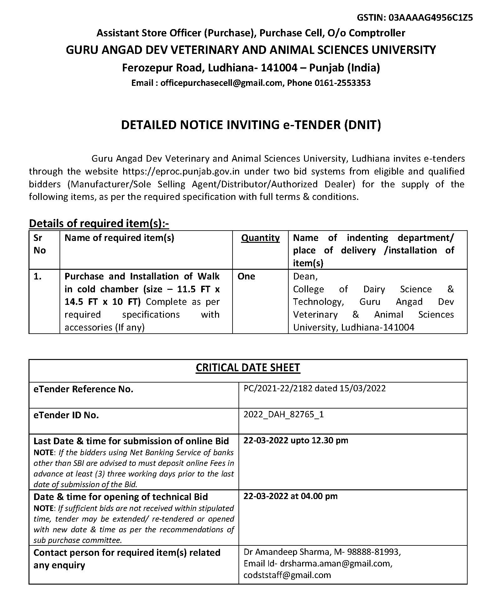 e-Tender for the purchase and Installation of Walk in cold chamber, Assistant Store Officer (Purchase), Purchase Cell, O/o Comptroller, GADVASU, Ludhiana