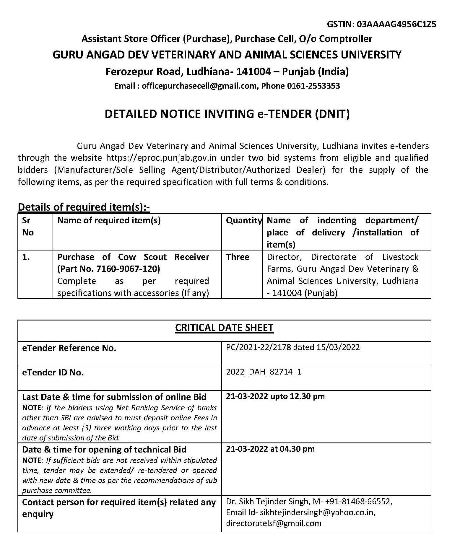 e- Tender for the purchase of Cow Scout Receiver, Assistant Store Officer (Purchase), Purchase Cell, O/o Comptroller, GADVASU, Ludhiana