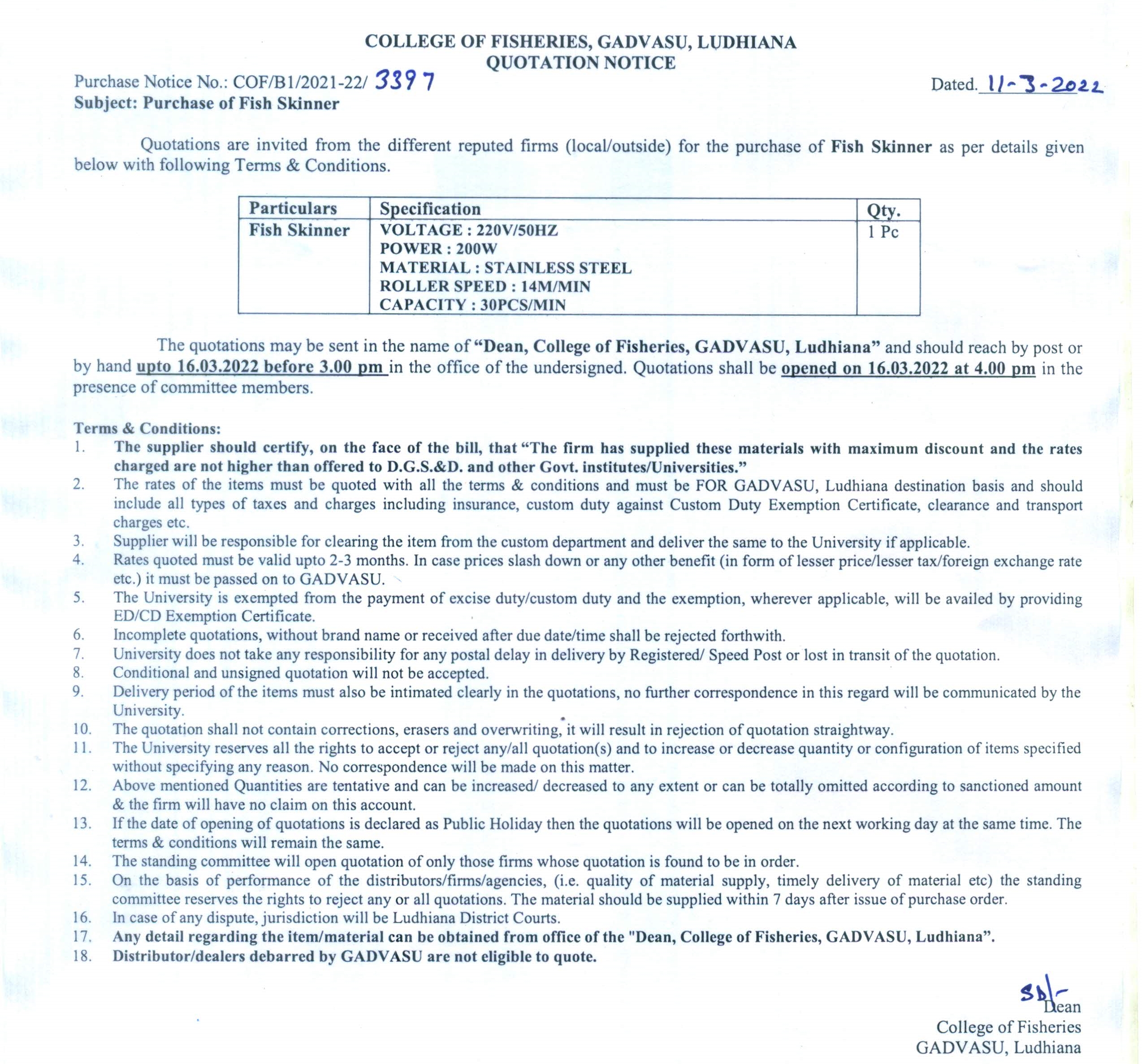 Quotation notice for the purchase of Fish Skinner, Dean, College of Fisheries, GADVASU, Ludhiana