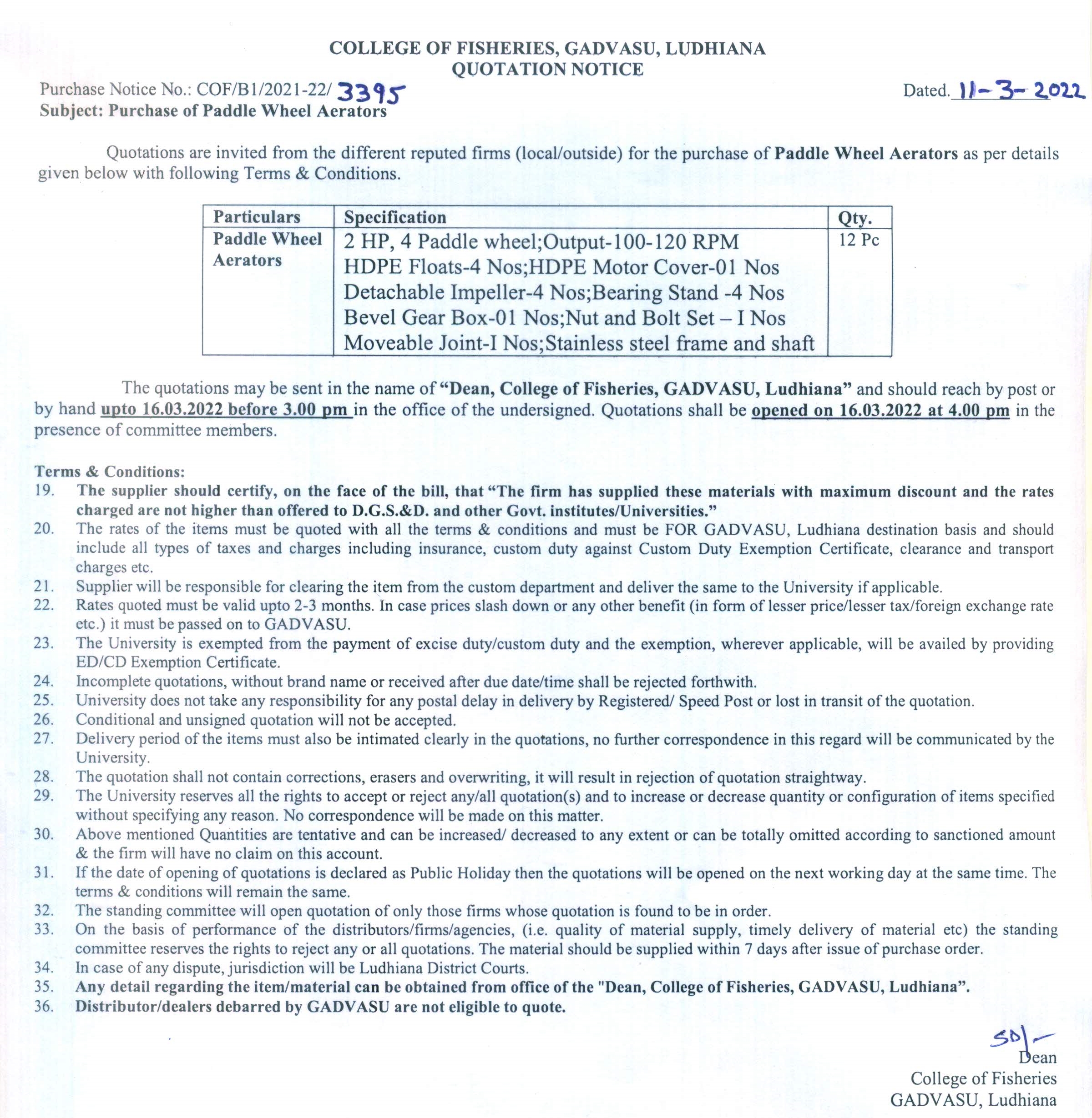 Quotation notice for the purchase of Paddle Wheel Aerators, Dean, College of Fisheries, GADVASU, Ludhiana