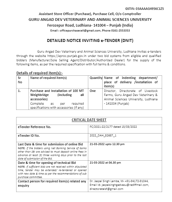 e-Tender for the Purchase and Installation of 100 MT Weighbridge, Assistant Store Officer (Purchase), Purchase Cell, O/o Comptroller, GADVASU, Ludhiana