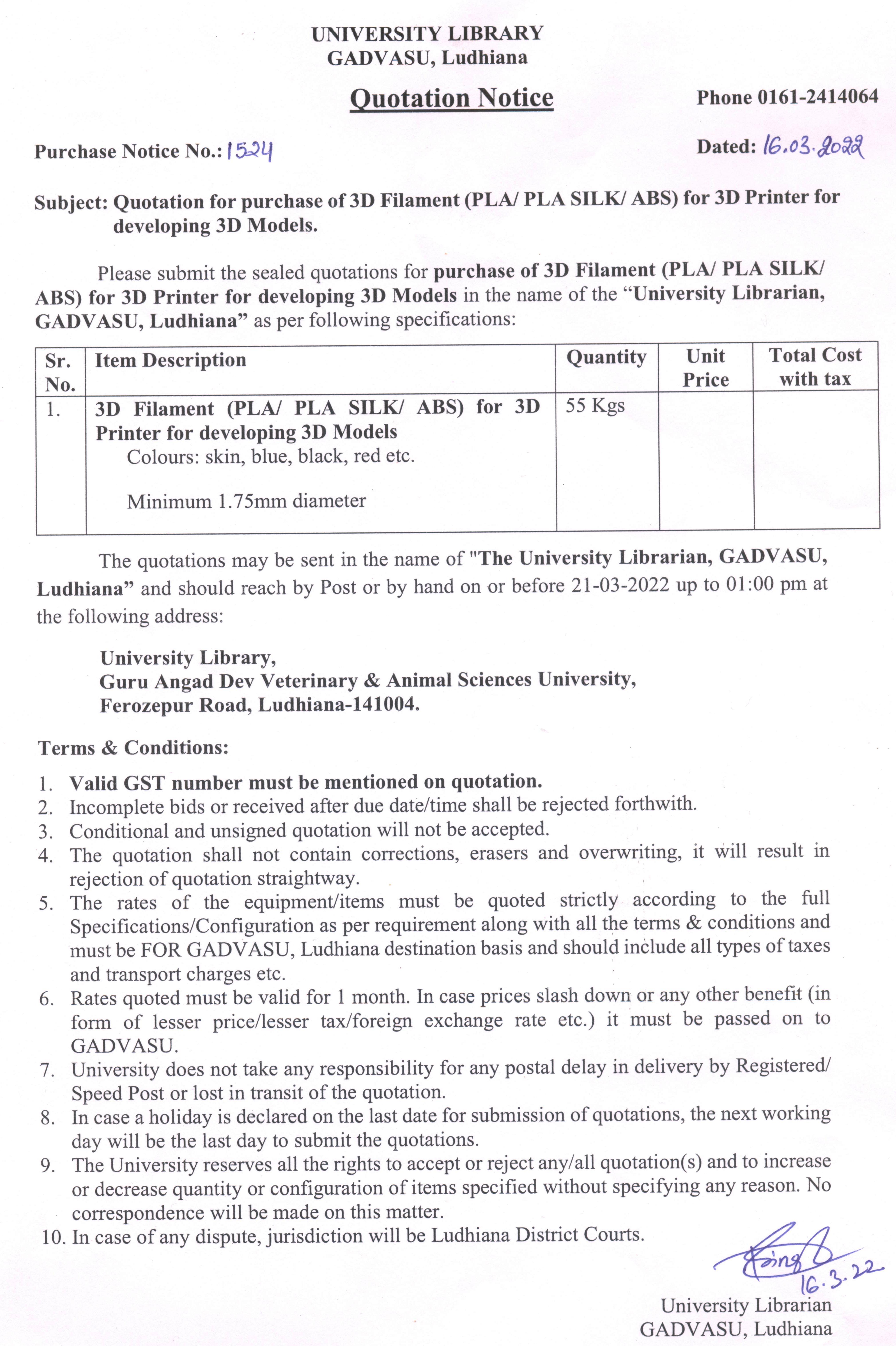Quotation Notice for the purchase of 3D Filament (PLA/ PLA Silk/ ABS) for 3D Printer for developing 3D Models, University Librarian, GADVASU, Ludhiana.