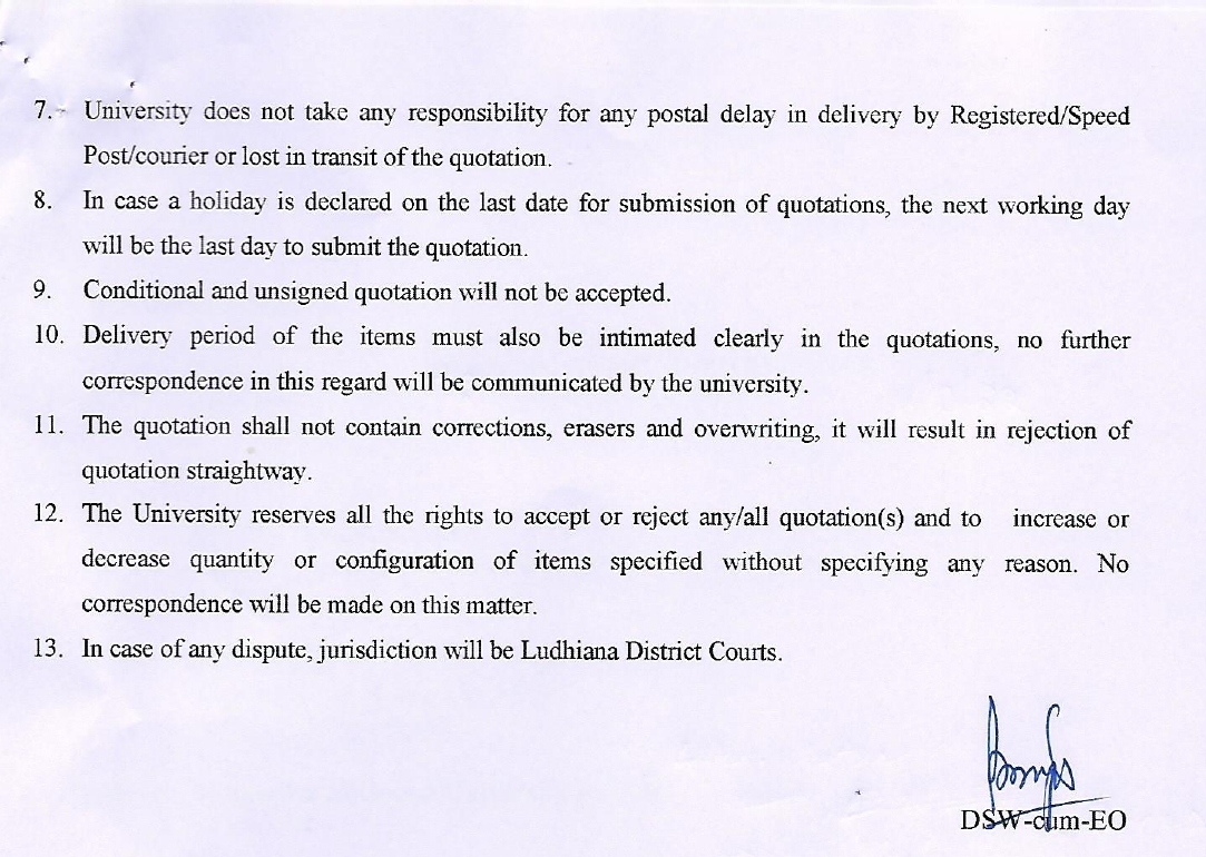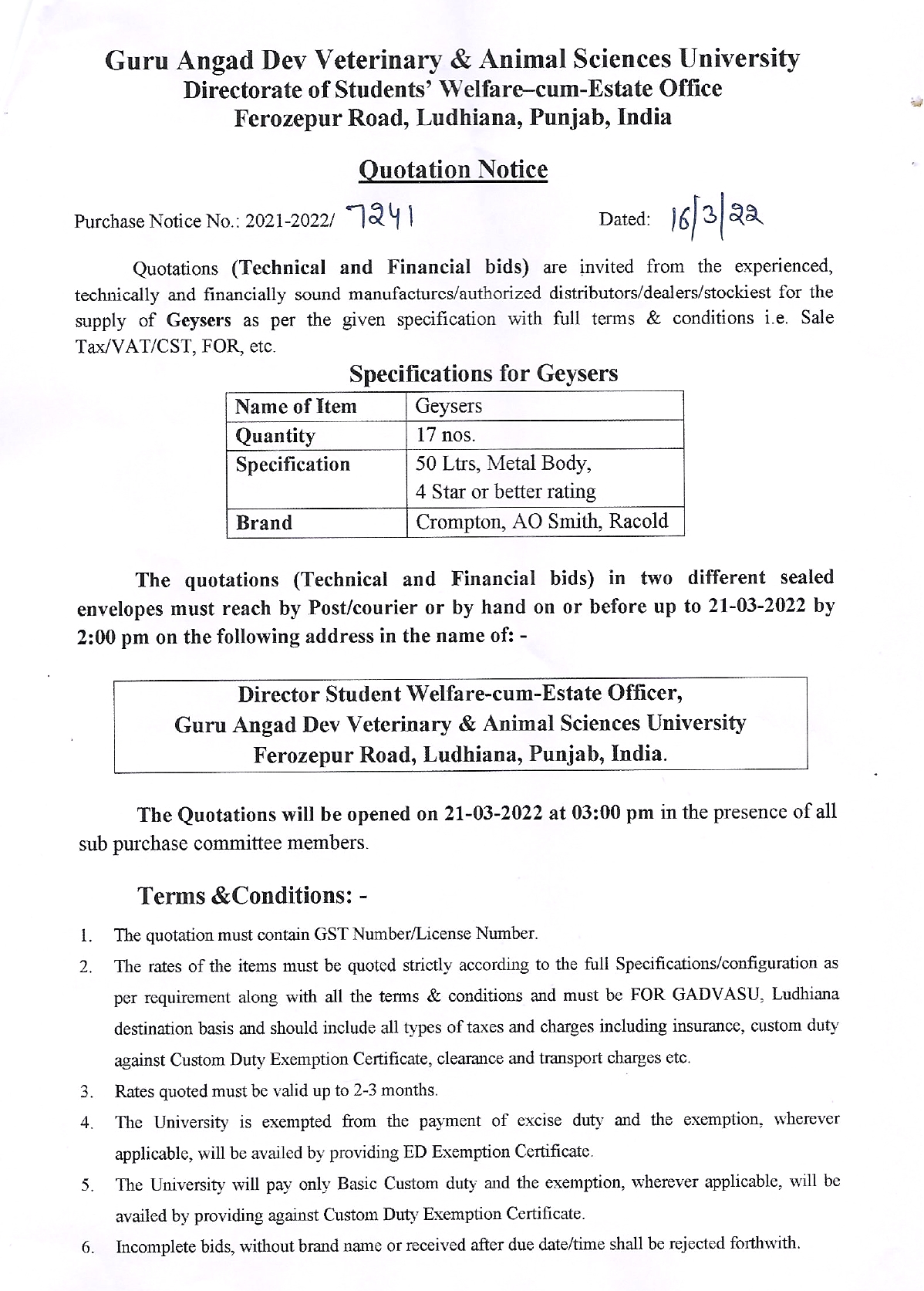 Quotation notice for the supply of Geysers, Directorate of Students Welfare-cum-Estate Office, GADVASU, Ludhiana