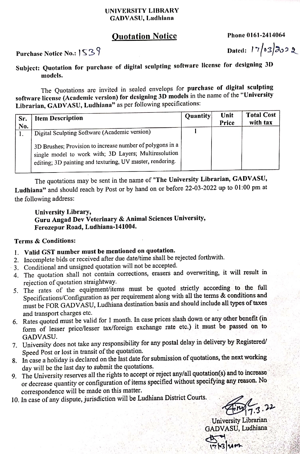 Quotation notice for the purchase of digital sculpting software license for designing 3D models, University Library, GADVASU, Ludhiana
