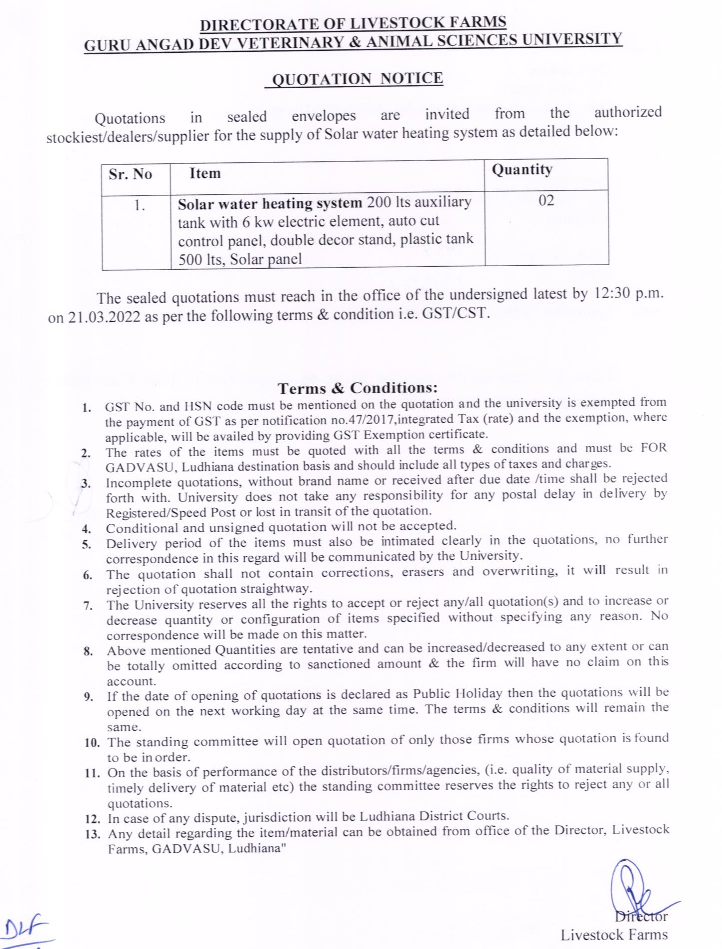 Quotation notice for the supply of Solar water heating system, Directorate of Livestock Farms, GADVASU, Ludhiana