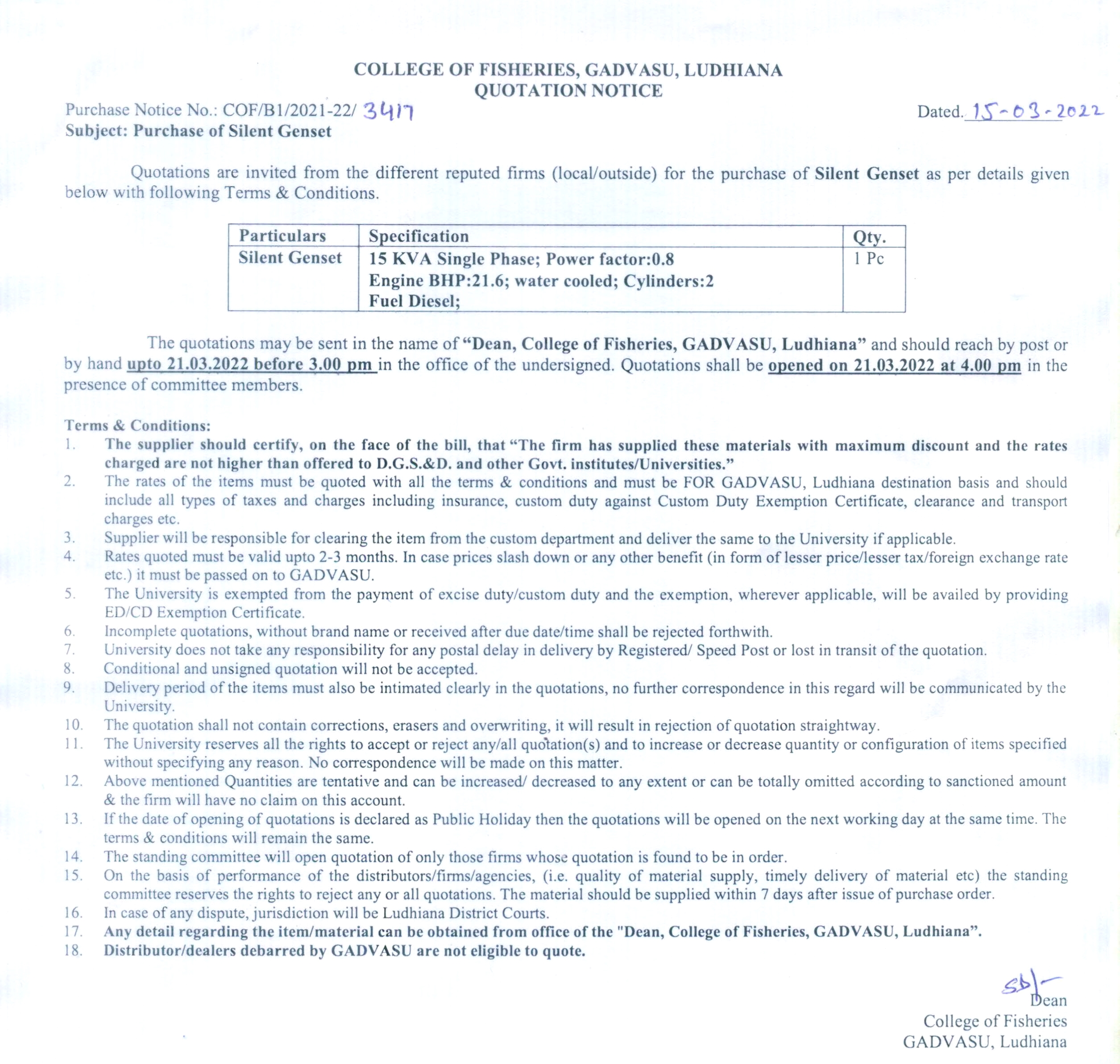 Quotation notice for the purchase of Silent Genset, Dean, College of Fisheries, GADVASU, Ludhiana