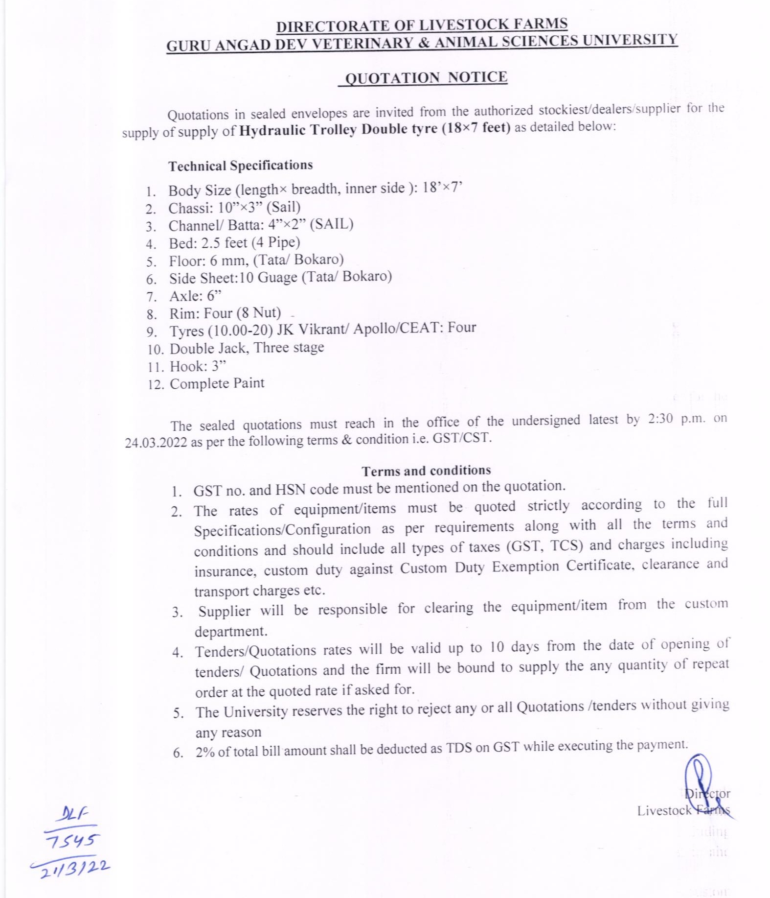 Quotation notice for the purchase of Hydraulic Trolley Double Tyre (18 x 7 feet), Directorate of Livestock Farms, GADVASU, Ludhiana