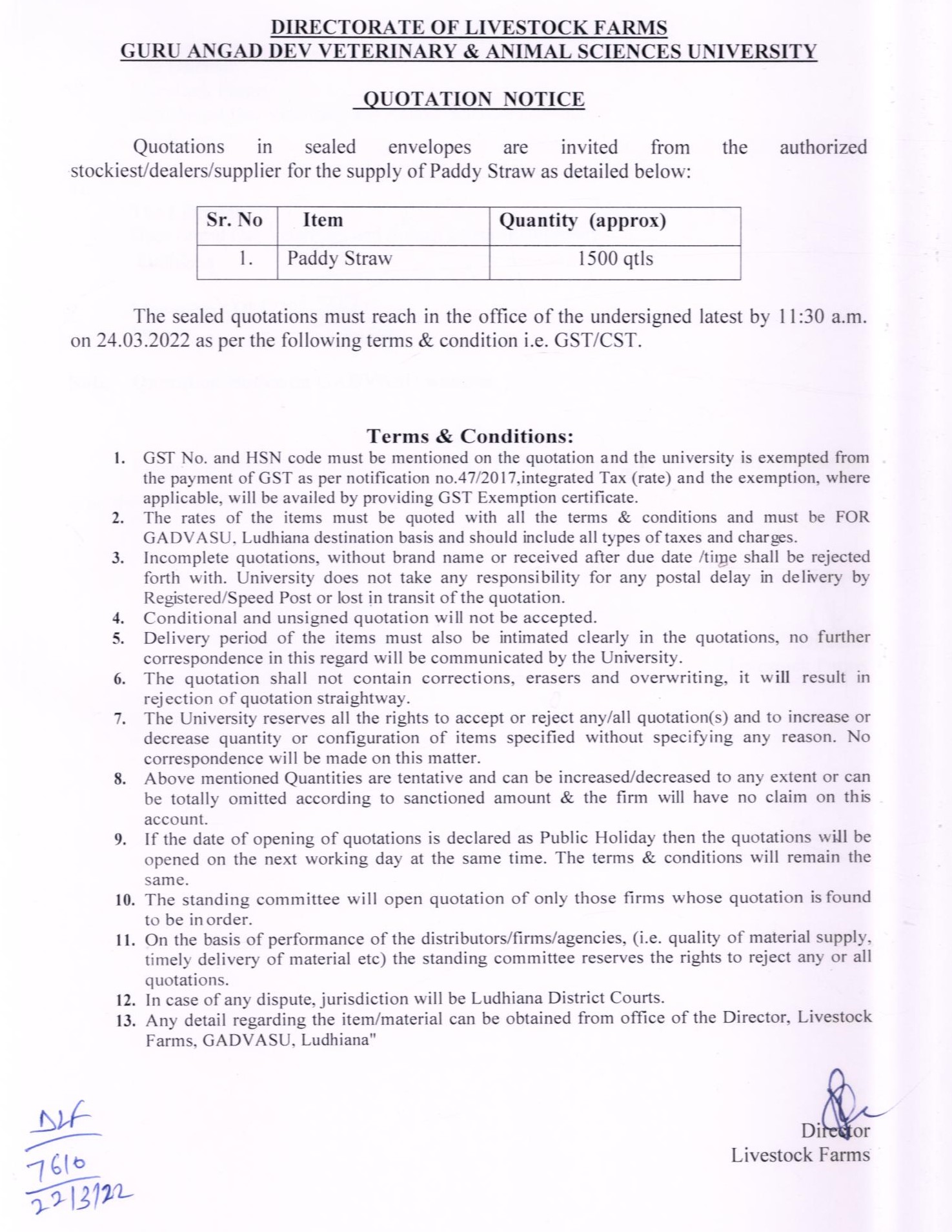 Quotation notice for the supply of paddy straw, Directorate of Livestock Farms, GADVASU, Ludhiana