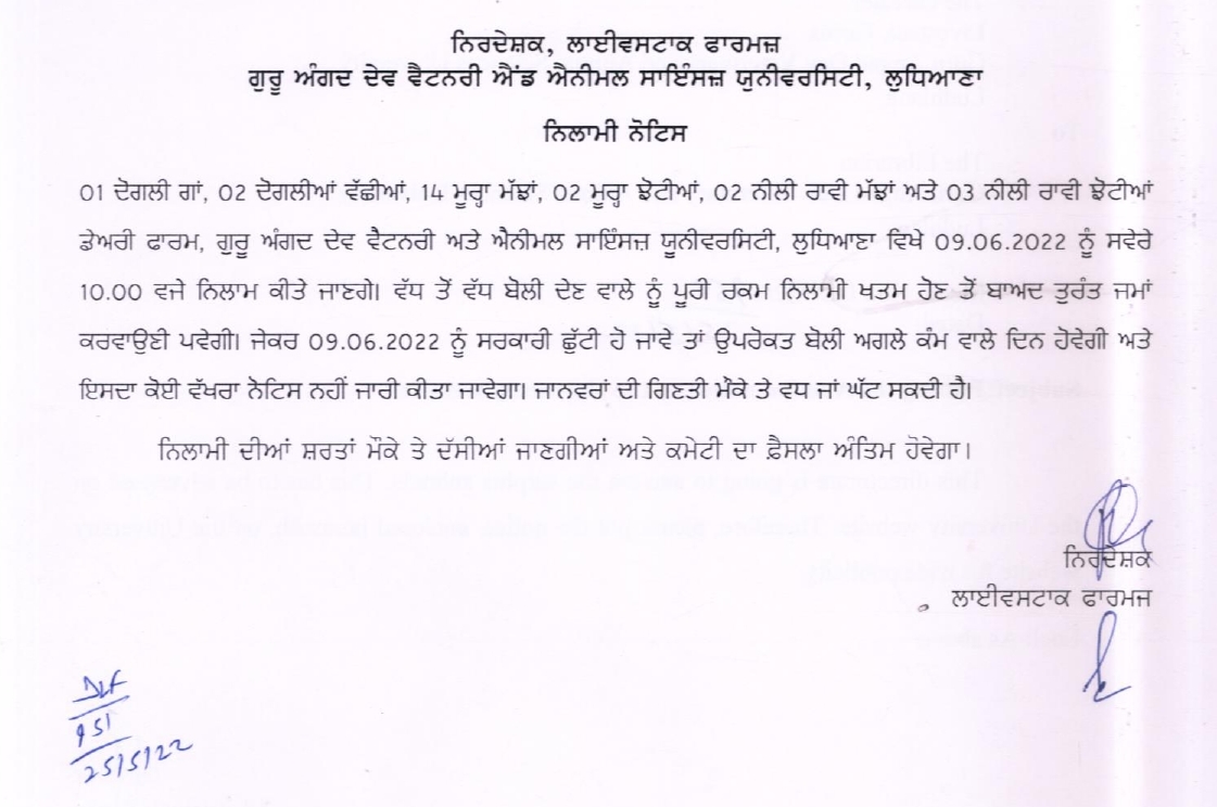 Auction Notice for surplus Animals, The Director, Livestock Farms, GADVASU, Ludhiana