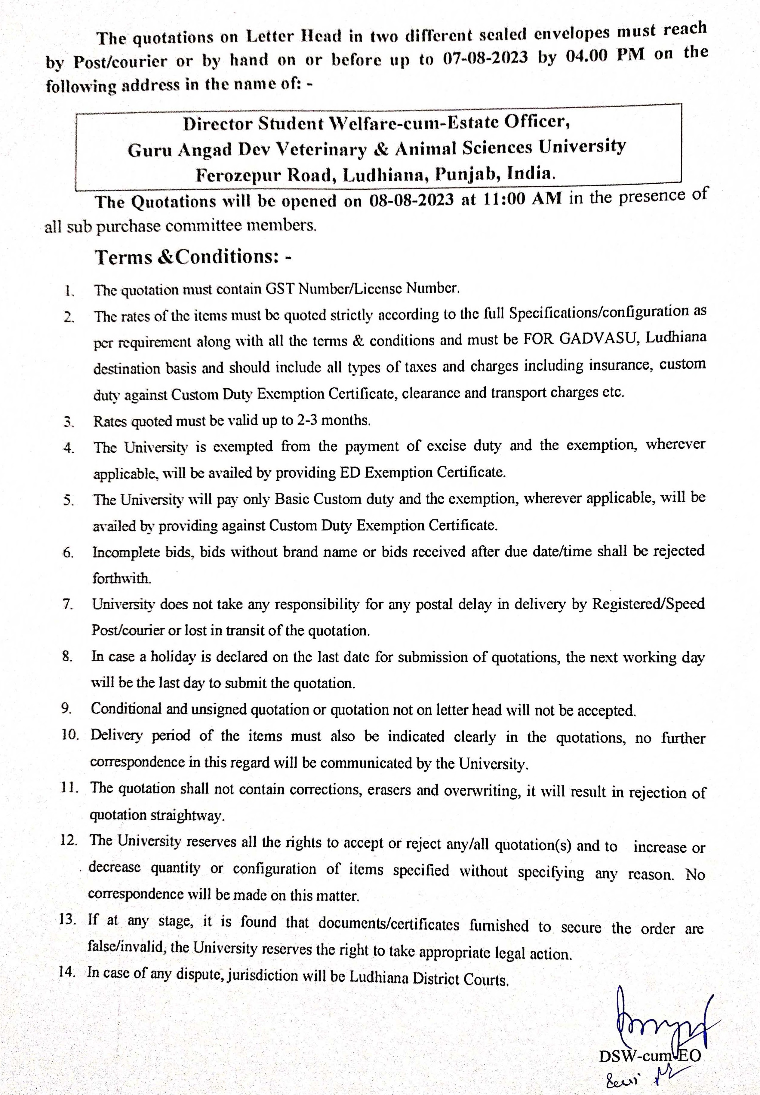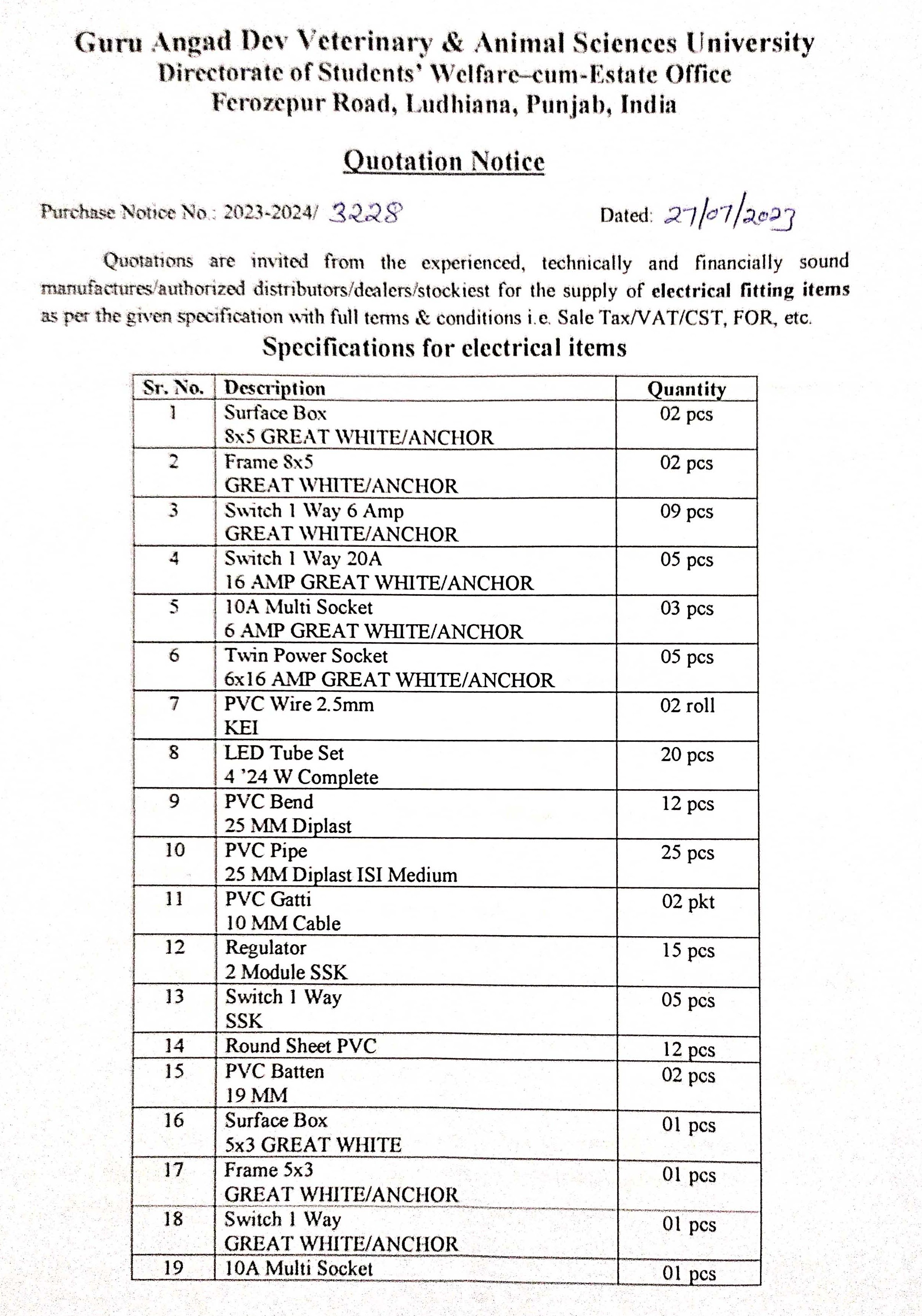 Quotation notice for the Purchase of Electrical Fitting Items, DSW-cum-EO, Guru Angad Dev Veterinary & Animal Sciences University, Ludhiana