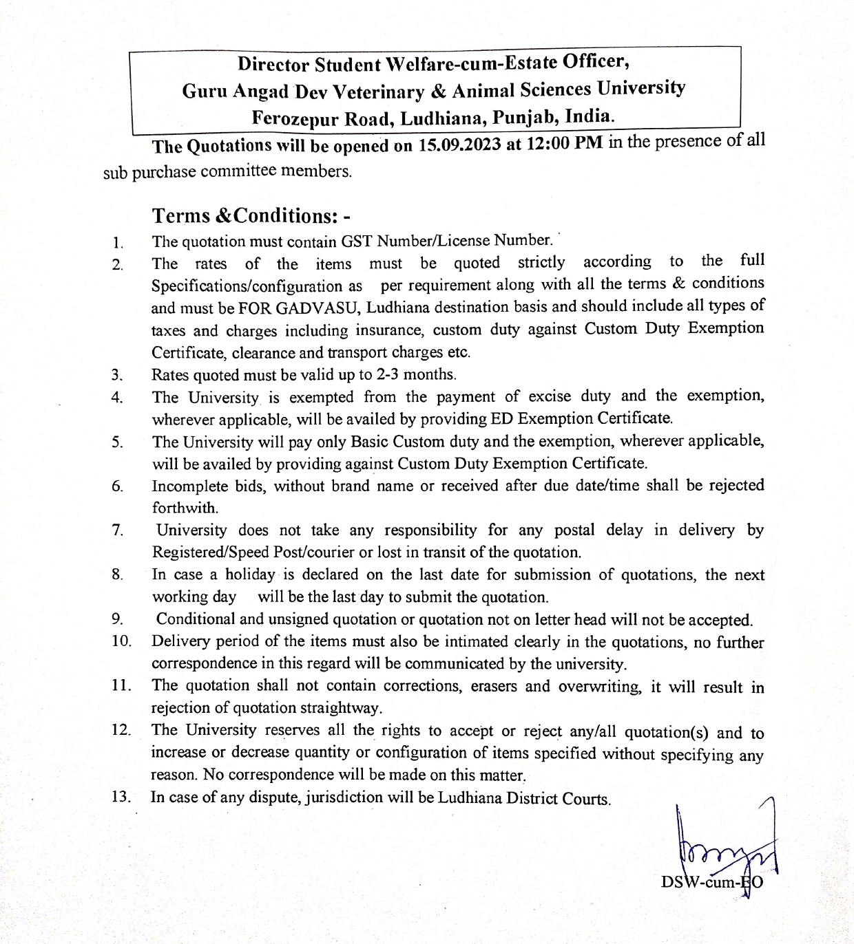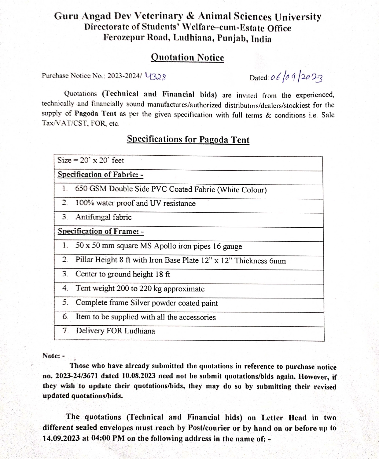 Quotation Notice for the supply of Pagoda Tent, Director Student Welfare-cum-Estate Officer, Guru Angad Dev Veterinary & Animal Sciences University, Ludhiana