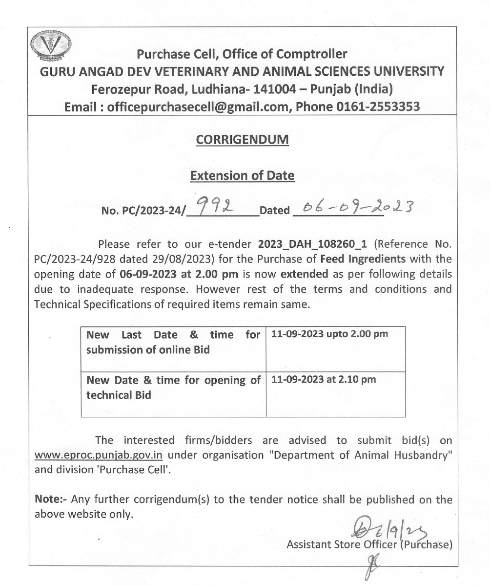 Corrigendum for Extension of dates of e -Tender for the Purchase of Feed Ingredients, Assistant Store Officer, Purchase Cell, Guru Angad Dev Veterinary and Animal Sciences University, Ludhiana