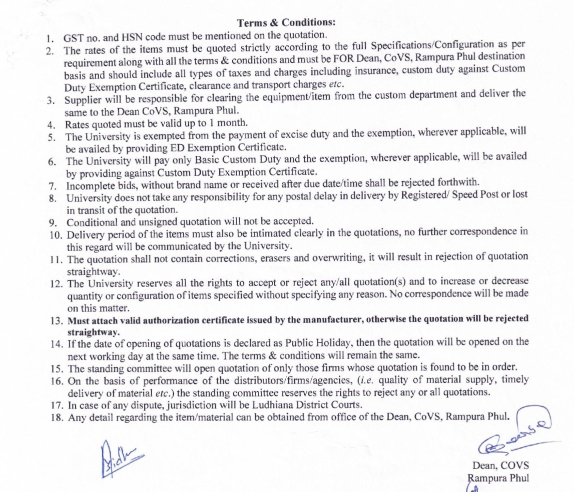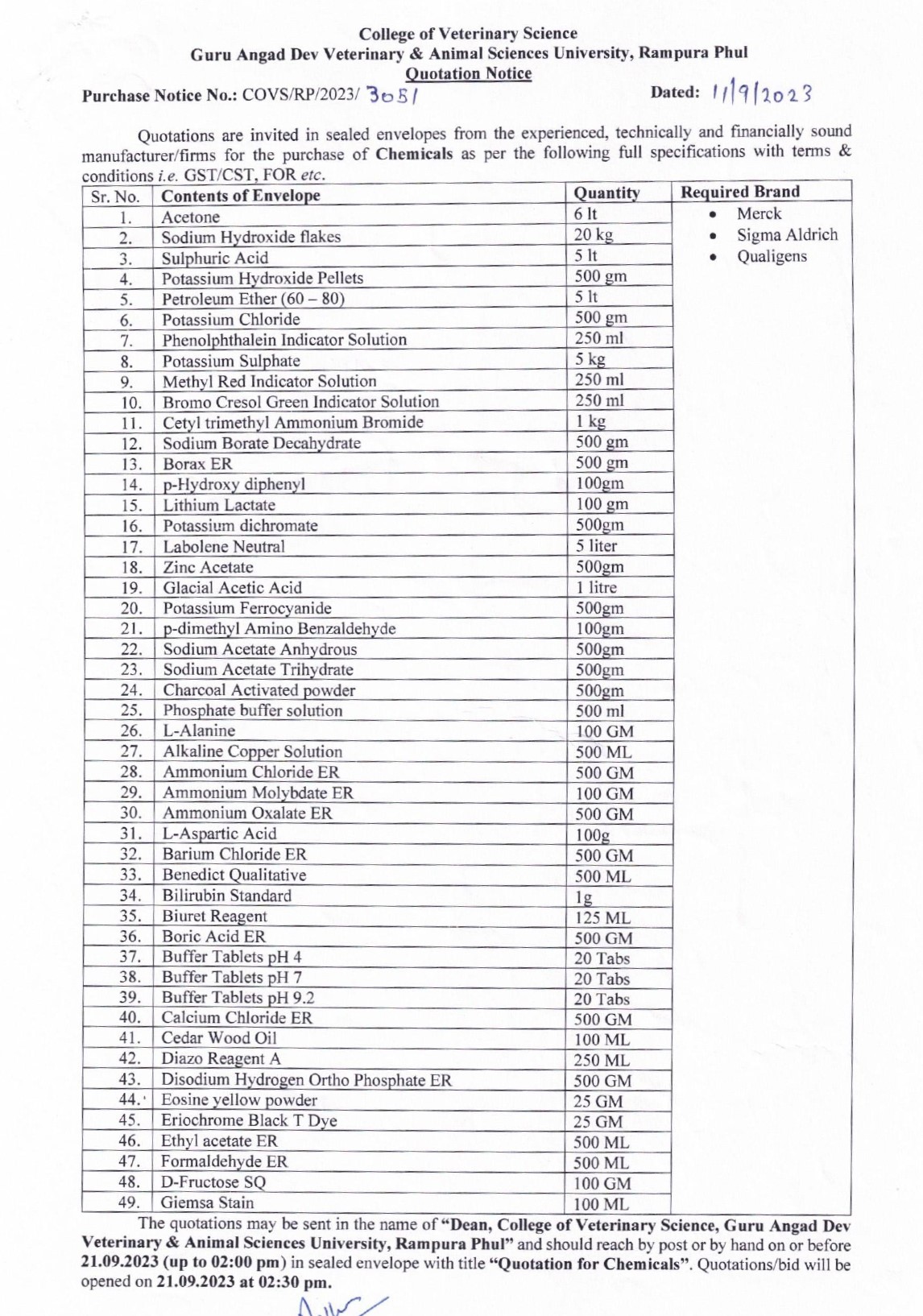 Quotation Notice for the purchase of Chemicals, Dean, College of Veterinary Science, Guru Angad Dev Veterinary & Animal Sciences University, Rampura Phul