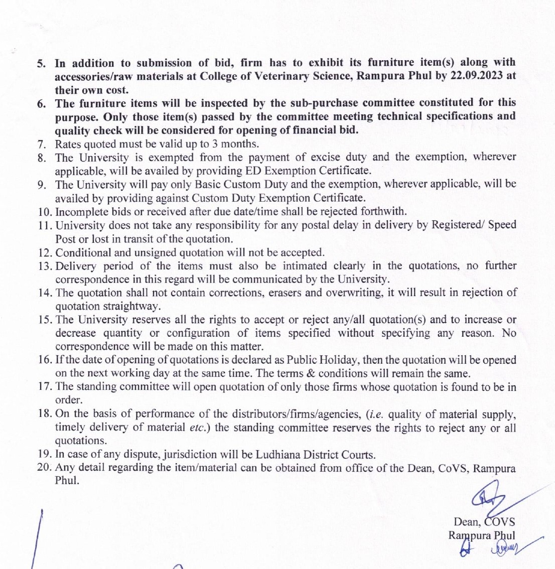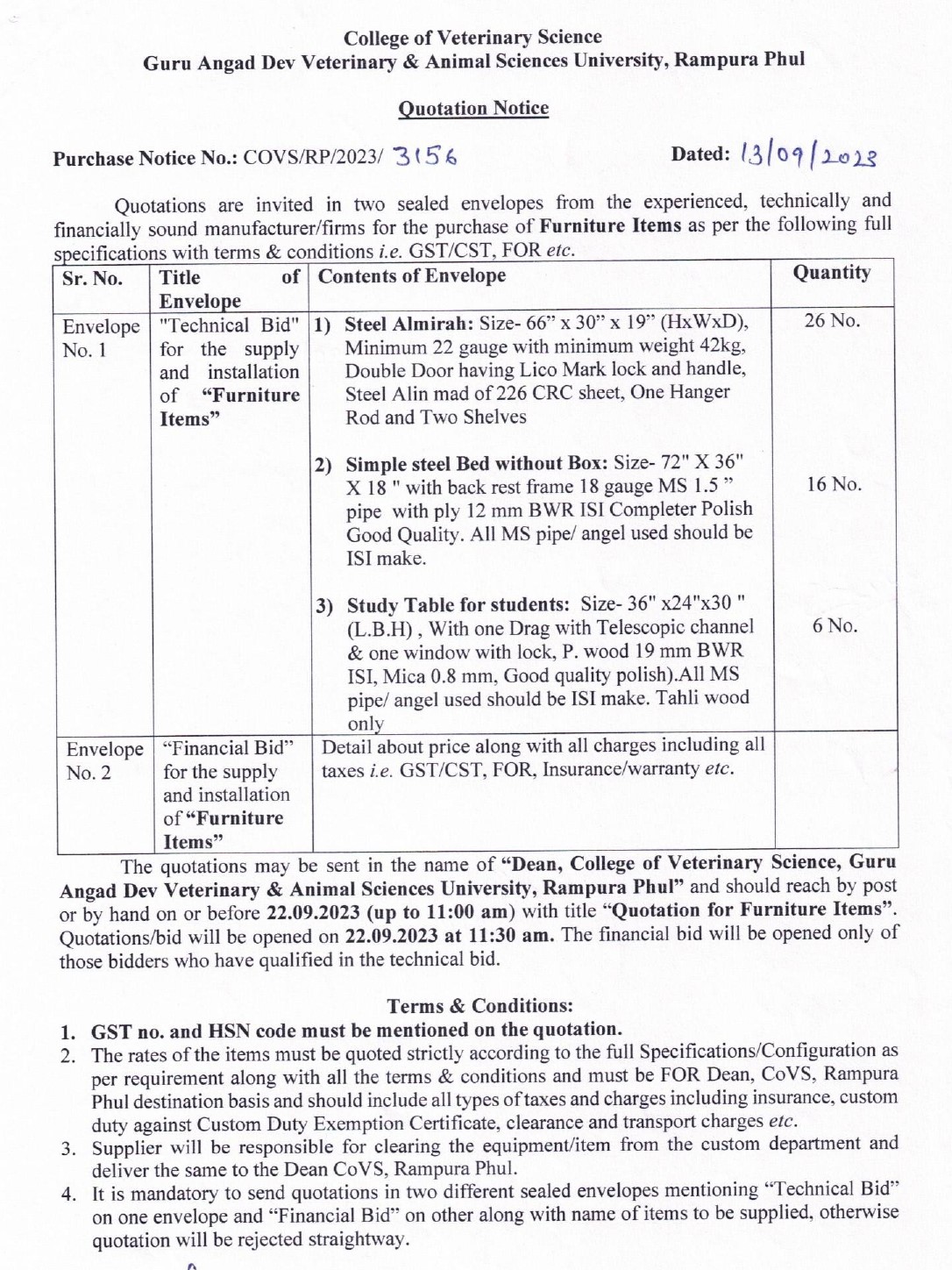 Quotation Notice for the purchase of Furniture Items, Dean, College of Veterinary Science, Guru Angad Dev Veterinary & Animal Sciences University, Rampura Phul