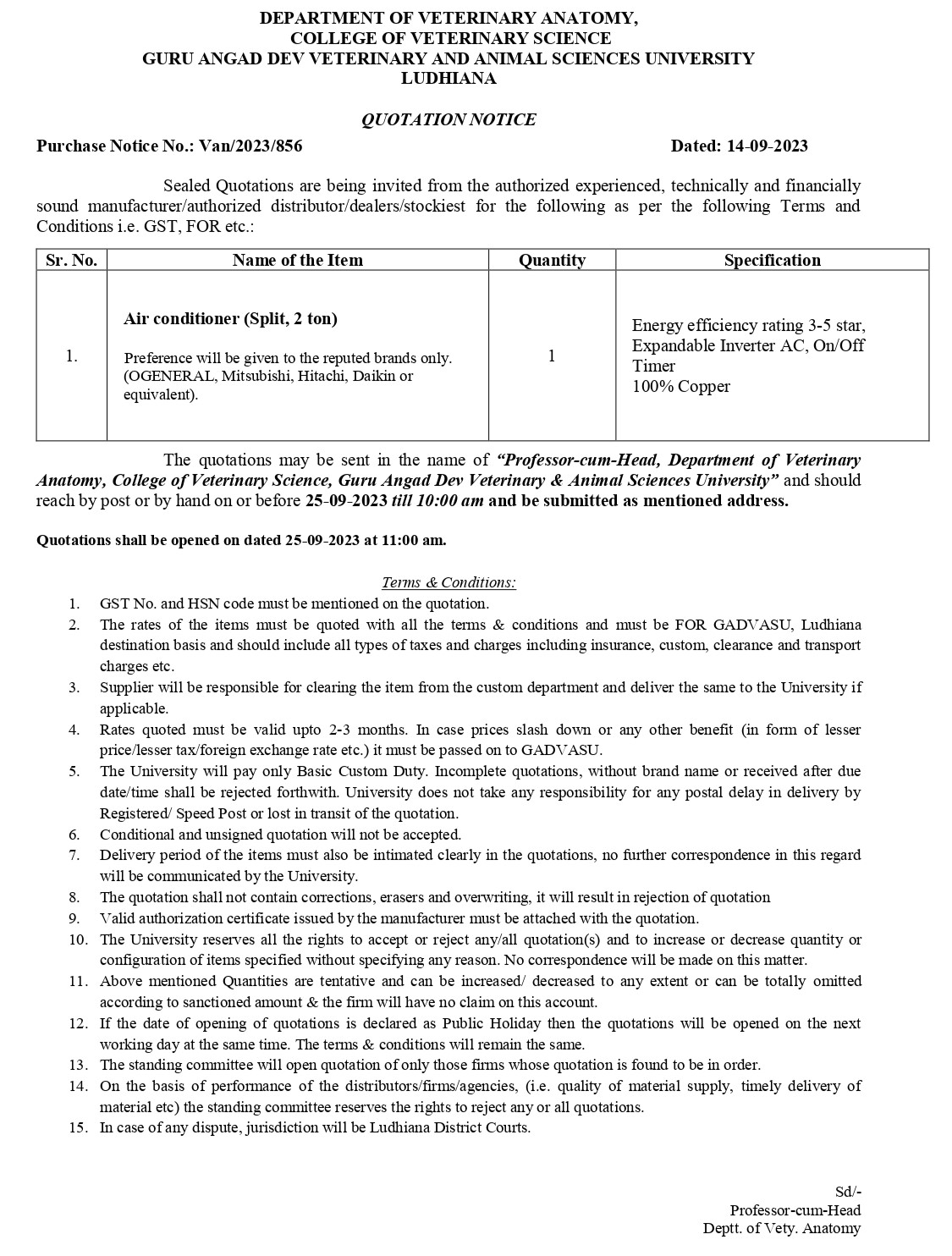 Quotation Notice for the purchase of Air conditioner, Professor-cum-Head, Dept.of Veterinary Anatomy, Guru Angad Dev Veterinary and Animal Sciences University, Ludhiana