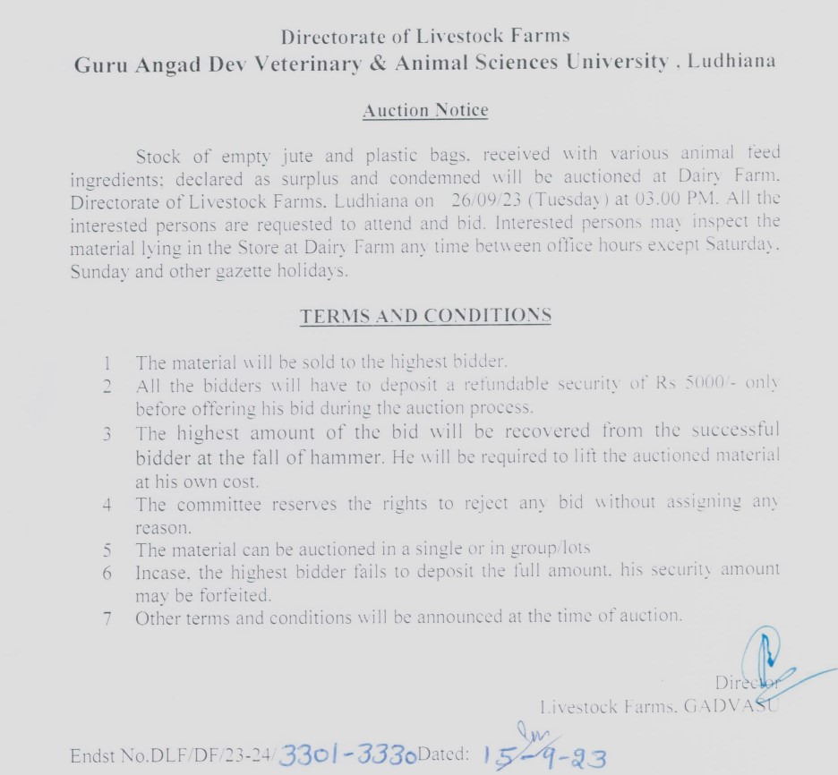 Auction notice for the Un-serviceable items, Director, Directorate of Livestock Farms, Guru Angad Dev Veterinary & Animal Sciences University, Ludhiana